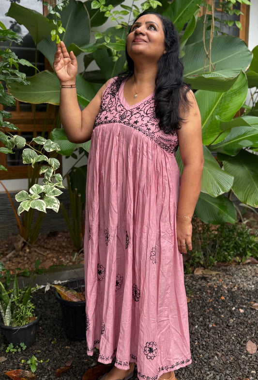 Sleeveless Aliya cut dress PRE-ORDER - Black knots on Onion Pink (with work on front and back)