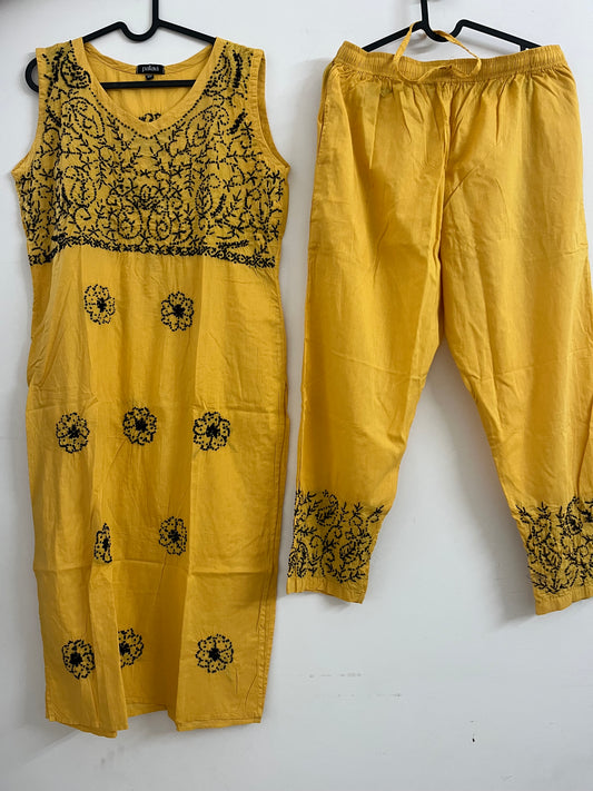 Sleeveless Straight Kurti and Pant (co-ord set) - Black knote on Mustard Yellow