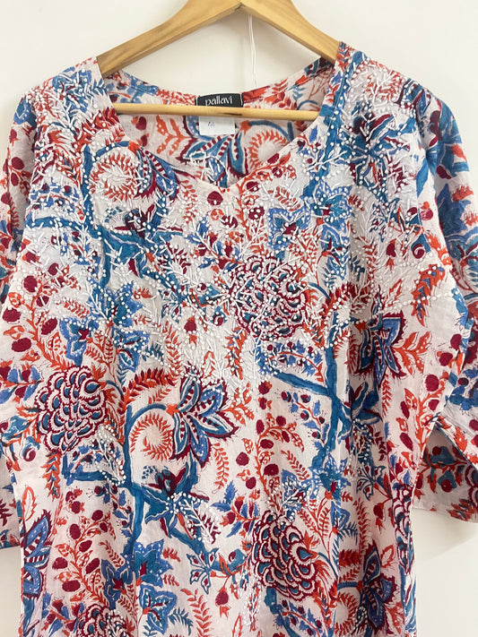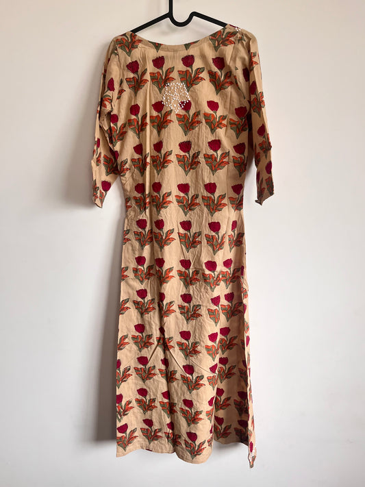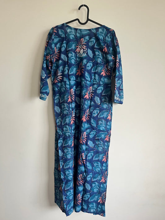 Expertly handcrafted in India for you, this Straight kurti with slits on both sides, the sleeveless coordinated set boasts intricate French knot work on the neck and pant bottom. Loose fitting for maximum comfort, this set is perfect for all-day wear. Elevate your wardrobe with this stunning set.
