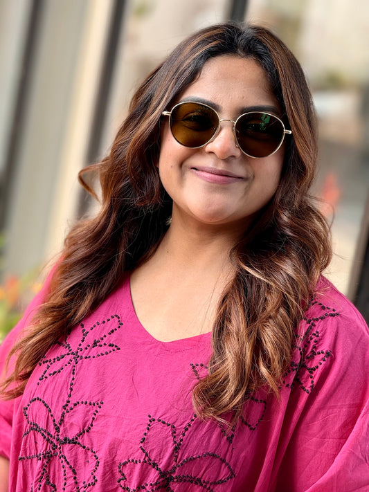 Expertly handcrafted in India for you, this curved kaftan stands out in its elegant simplicity. Made of Jaipur block printed and Buti cotton and adorned with intricate French knot handwork, this free-size piece is a true work of art. Perfect for anyone looking for a unique and beautiful addition to their wardrobe.