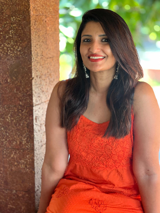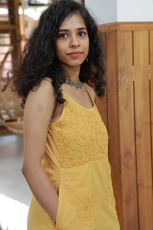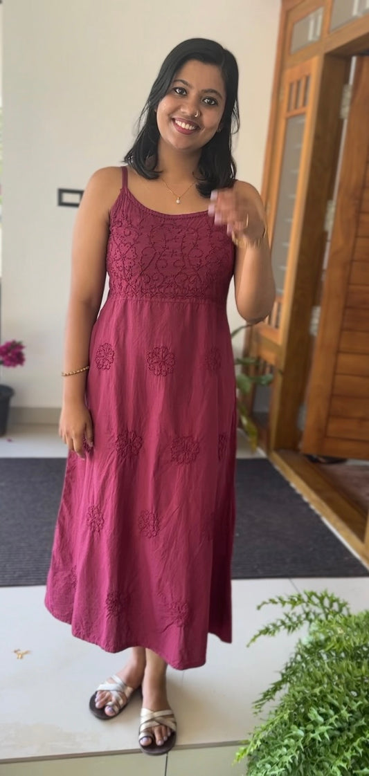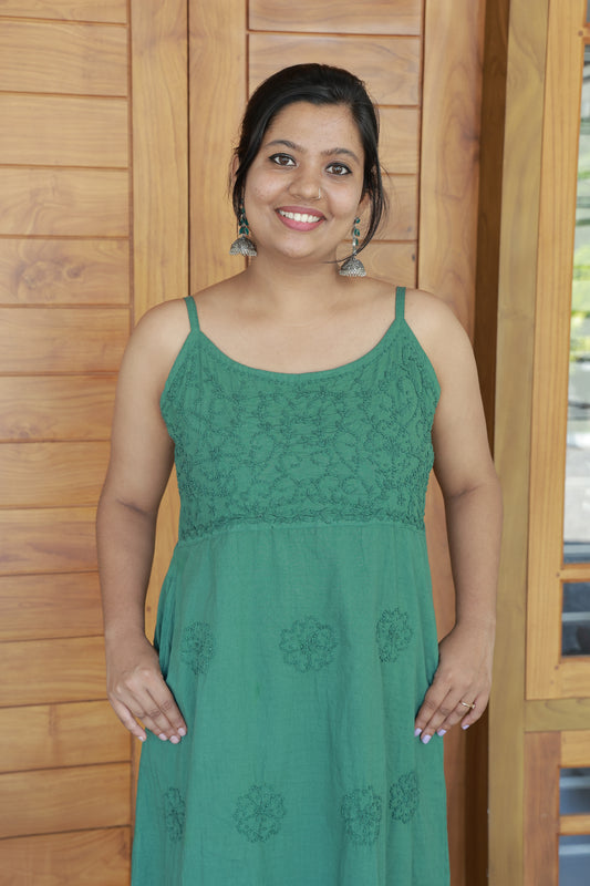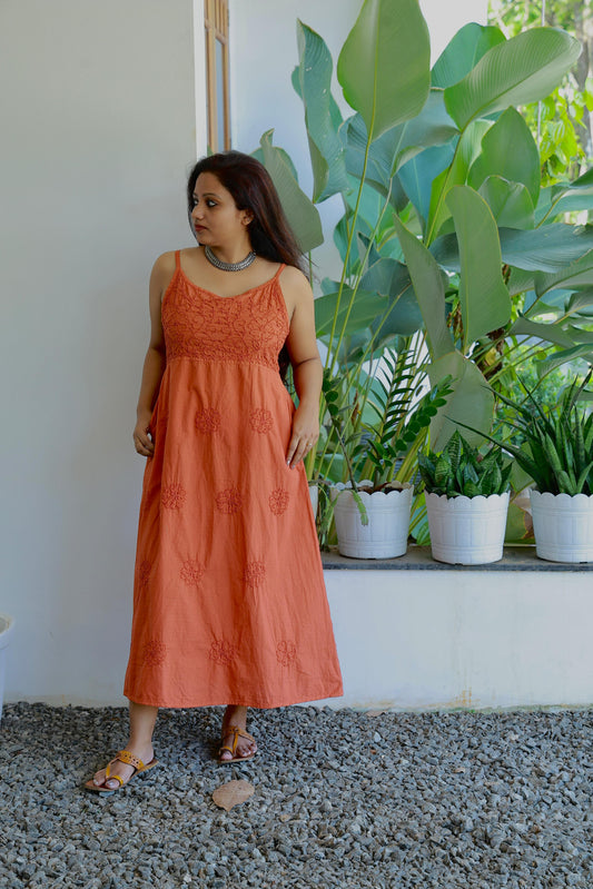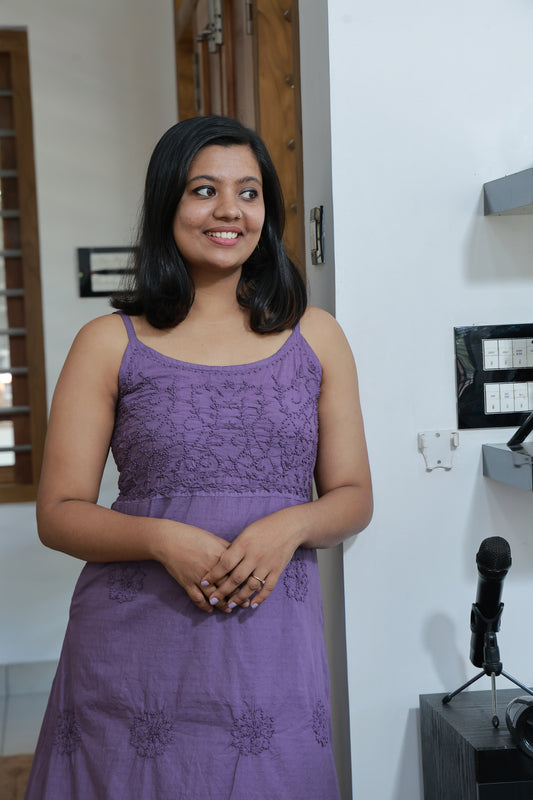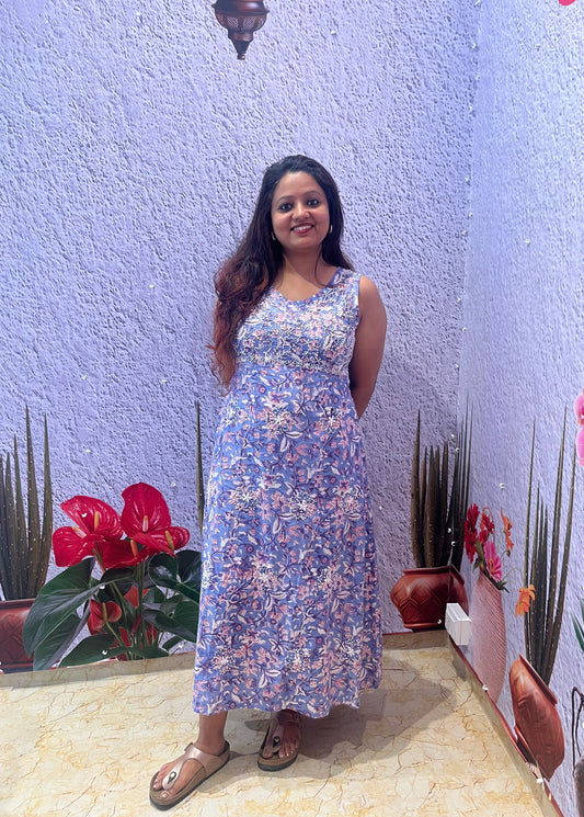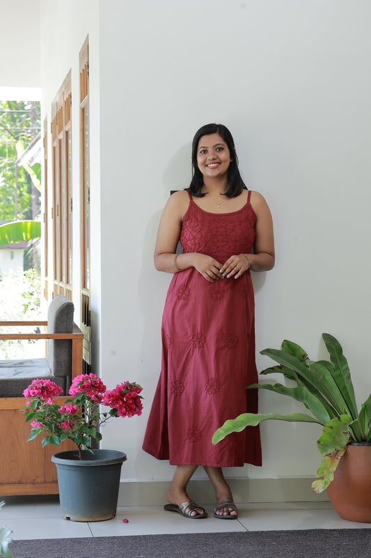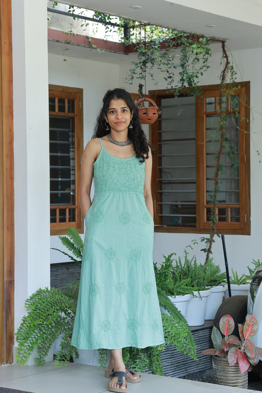 Expertly handcrafted in India for you, Sleeveless A line dress stands out in its elegant simplicity and pockets on both sides. It has intricate French knot handwork and this piece is a true work of art. Perfect for anyone looking for a unique and beautiful addition to their wardrobe.