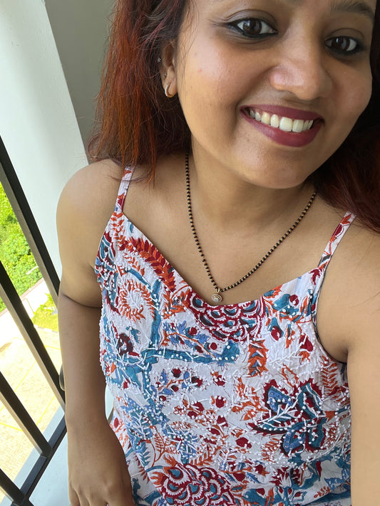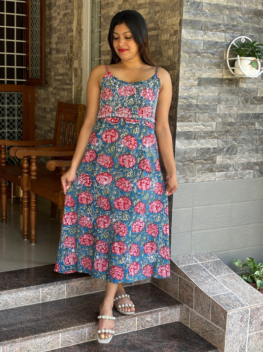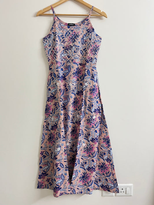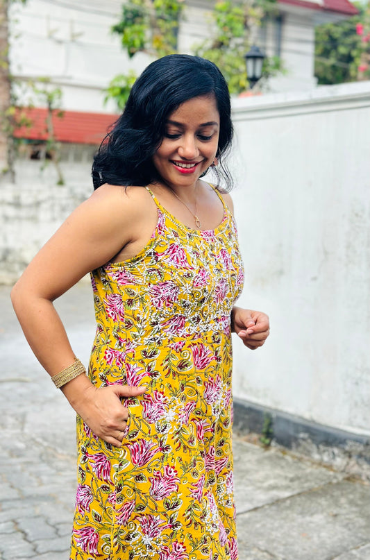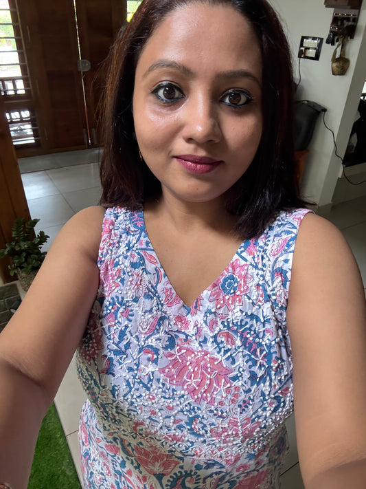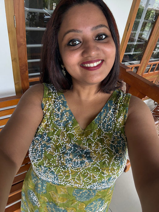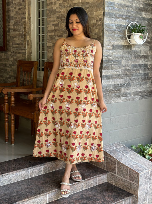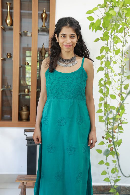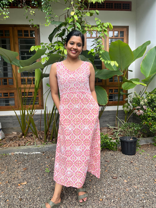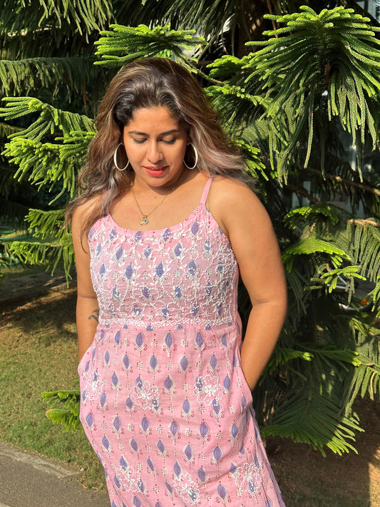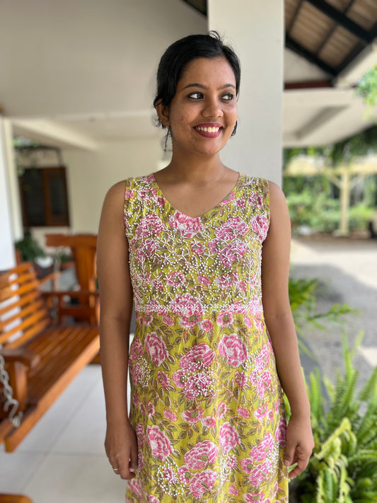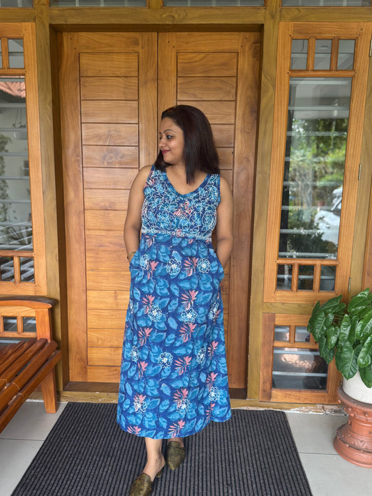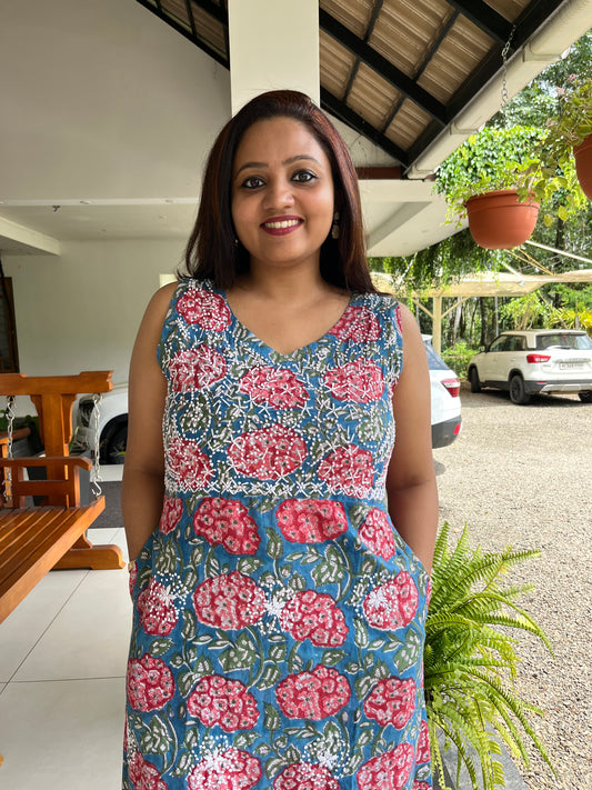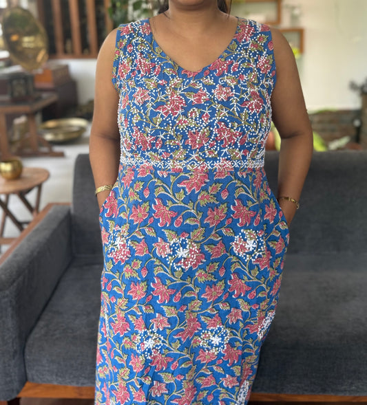 Expertly handcrafted in India for you, Sleeveless A line dress stands out in its elegant simplicity and pockets on both sides. It has intricate French knot handwork and this piece is a true work of art. Perfect for anyone looking for a unique and beautiful addition to their wardrobe.
