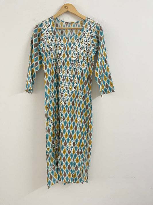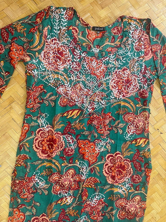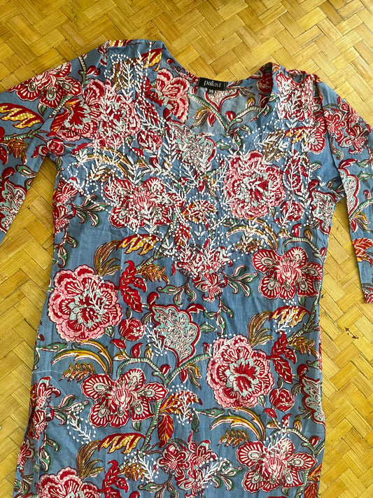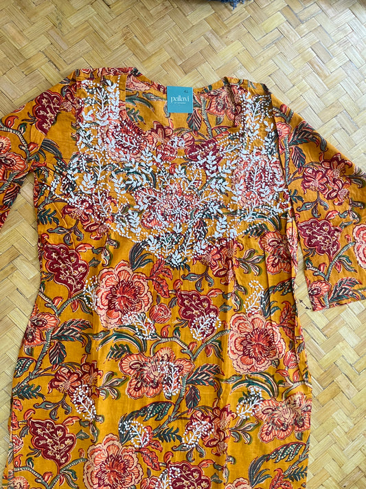 Expertly handcrafted in India for you, this Straight Kurti stands out in its elegant simplicity. It is adorned with intricate French knot handwork and is a true work of art. Perfect for anyone looking for a unique and beautiful addition to their wardrobe.