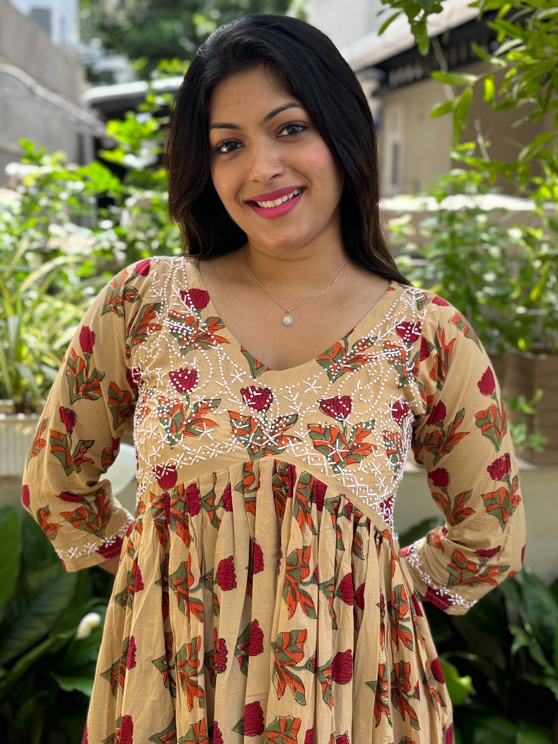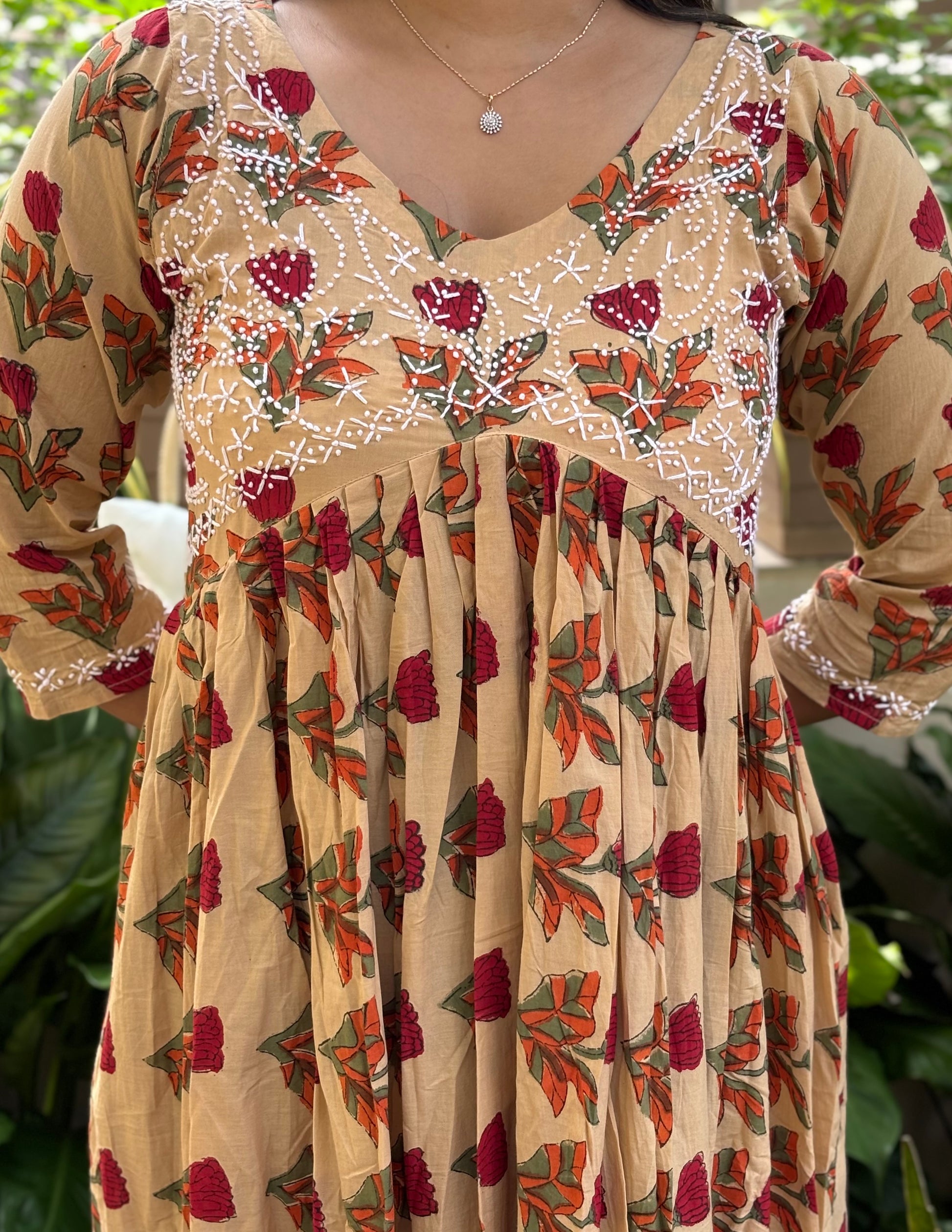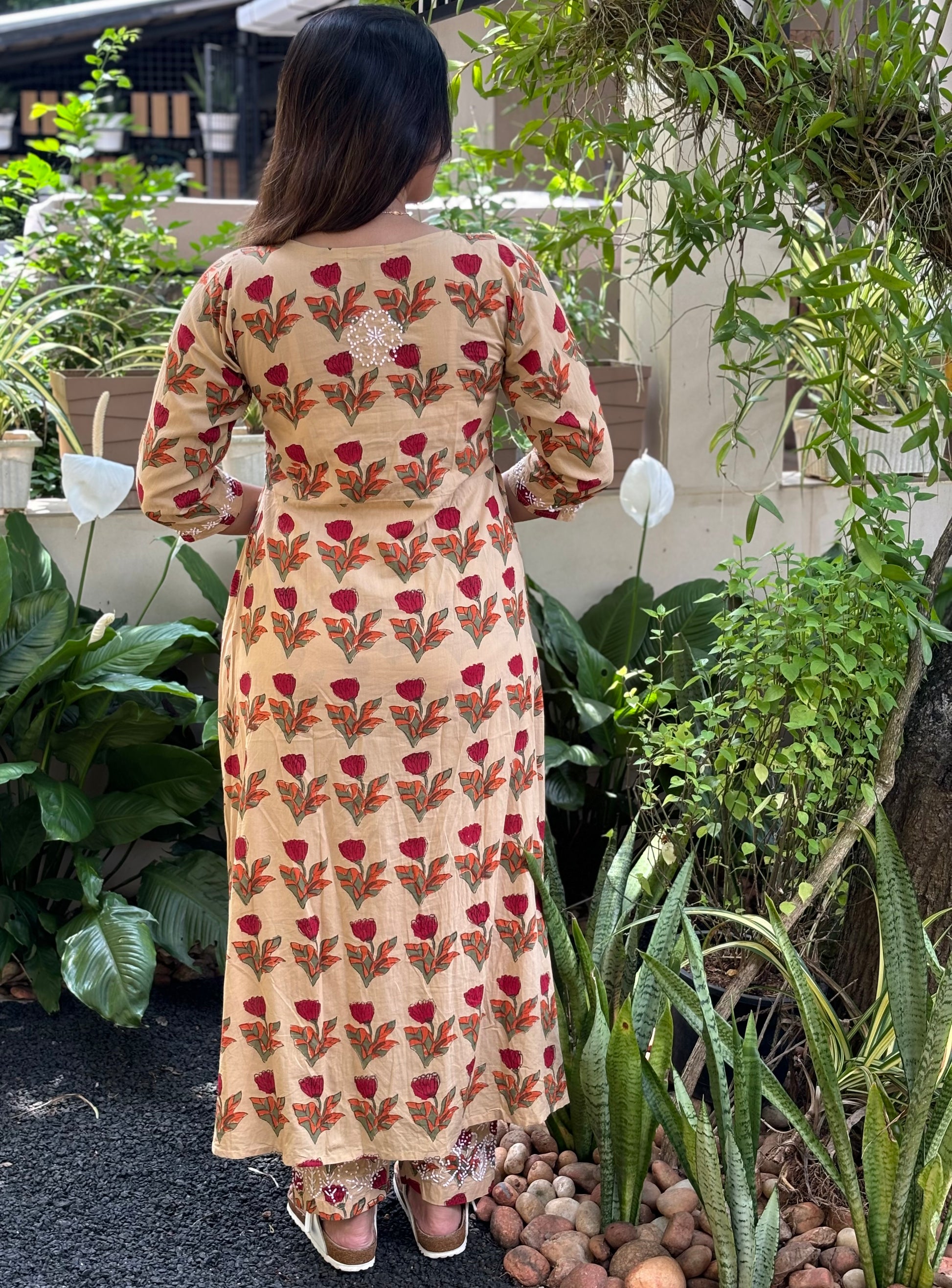 Expertly handcrafted in India for you, this Aliya Cut Dress and pants stands out in its elegant simplicity. Made of Jaipur block printed cotton and adorned with intricate French knot handwork, this dress is a true work of art pairing with same printed pants with pockets on both sides. Perfect for anyone looking for a unique and beautiful addition to their wardrobe.