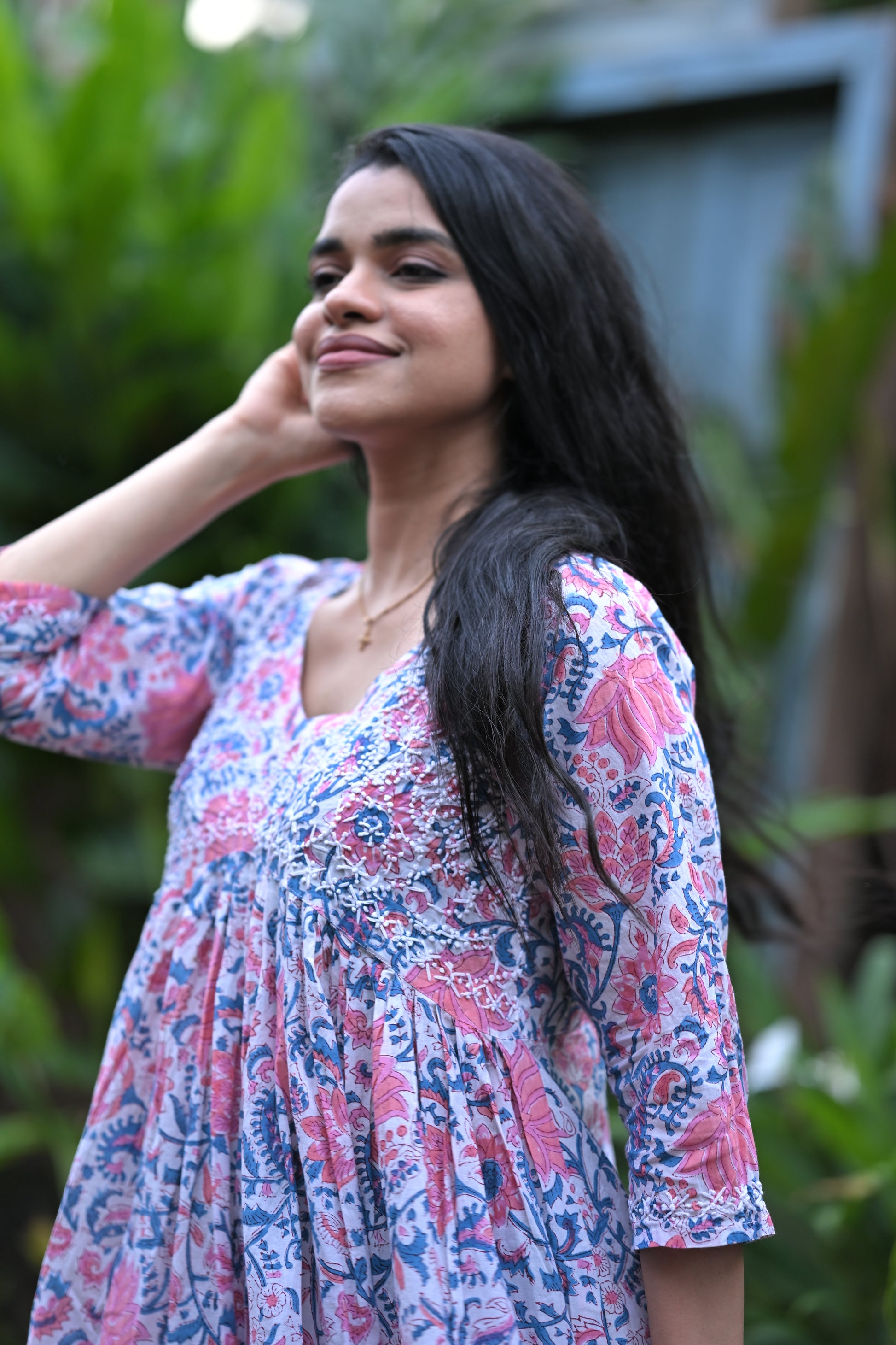 Expertly handcrafted in India for you, this Aliya Cut Dress and pants stands out in its elegant simplicity. Made of Jaipur block printed cotton and adorned with intricate French knot handwork, this dress is a true work of art pairing with same printed pants with pockets on both sides. Perfect for anyone looking for a unique and beautiful addition to their wardrobe.