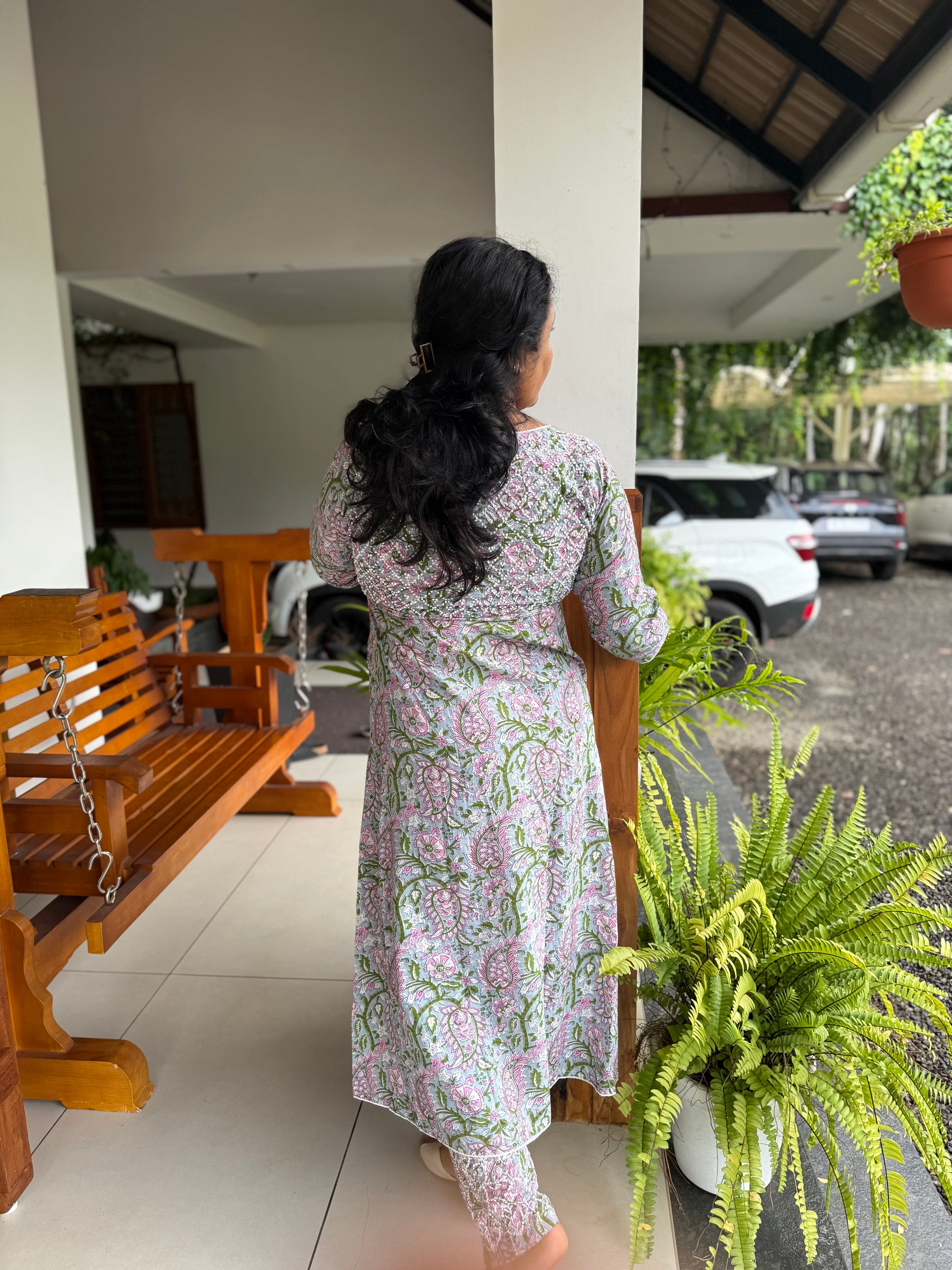 Expertly handcrafted in India for you, this Angrakha stands out in its elegant simplicity. Made of Jaipur block printed cotton and adorned with intricate French knot handwork, this piece is a true work of art pairing with same printed pants with pockets on both sides. Perfect for anyone looking for a unique and beautiful addition to their wardrobe.