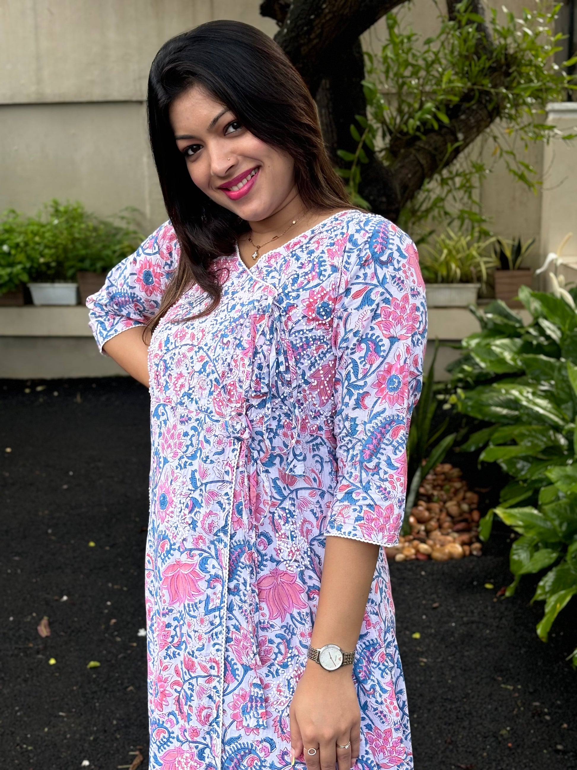 Expertly handcrafted in India for you, this Angrakha stands out in its elegant simplicity. Made of Jaipur block printed cotton and adorned with intricate French knot handwork, this piece is a true work of art pairing with same printed pants with pockets on both sides. Perfect for anyone looking for a unique and beautiful addition to their wardrobe.