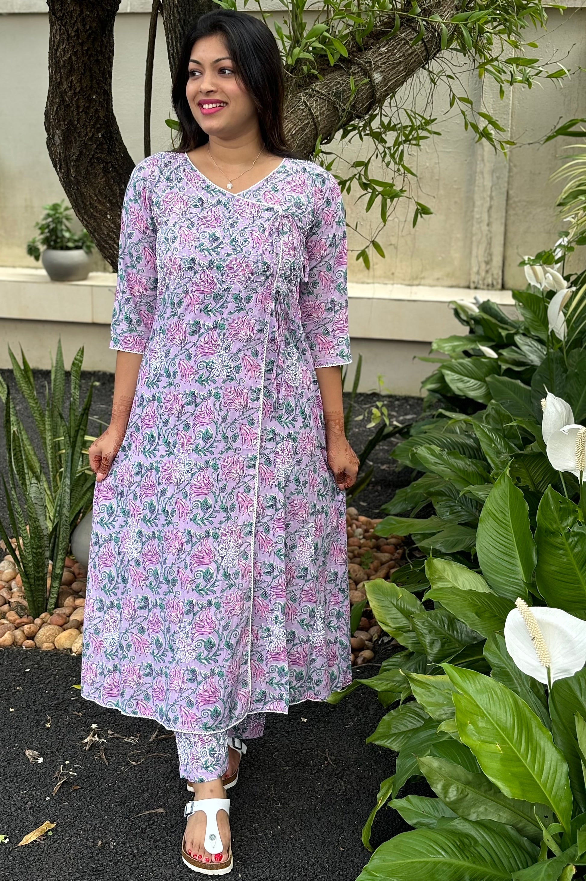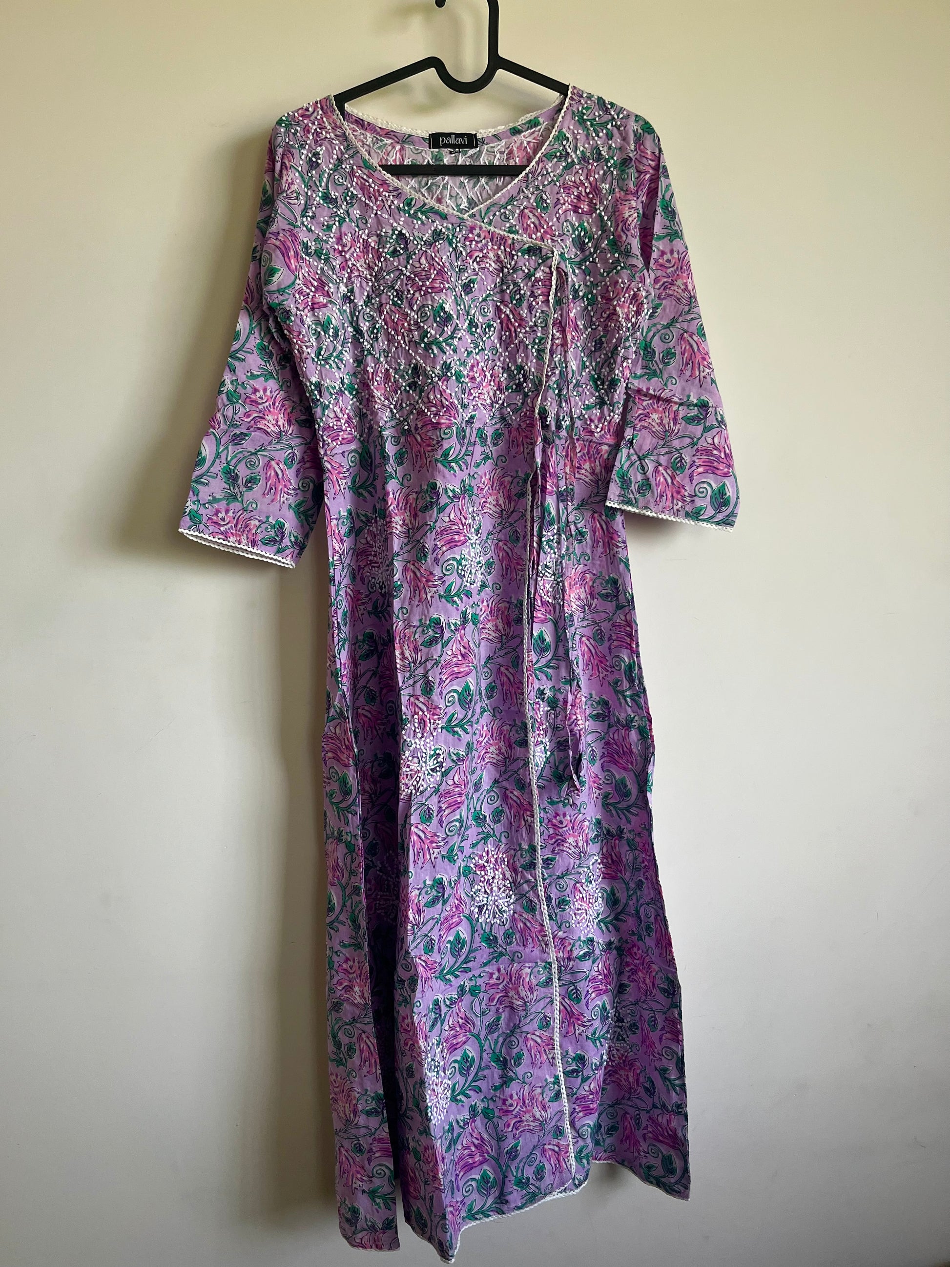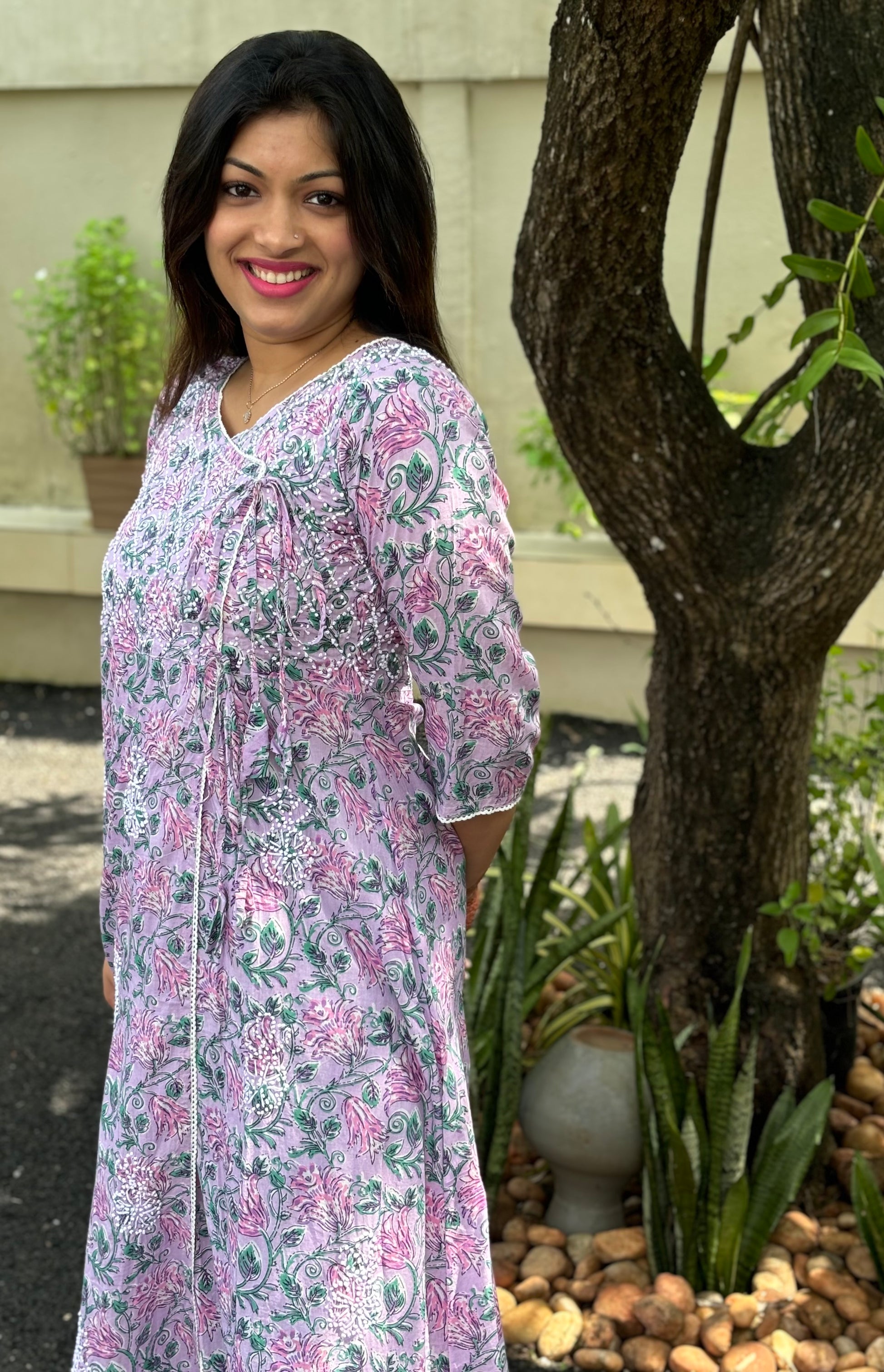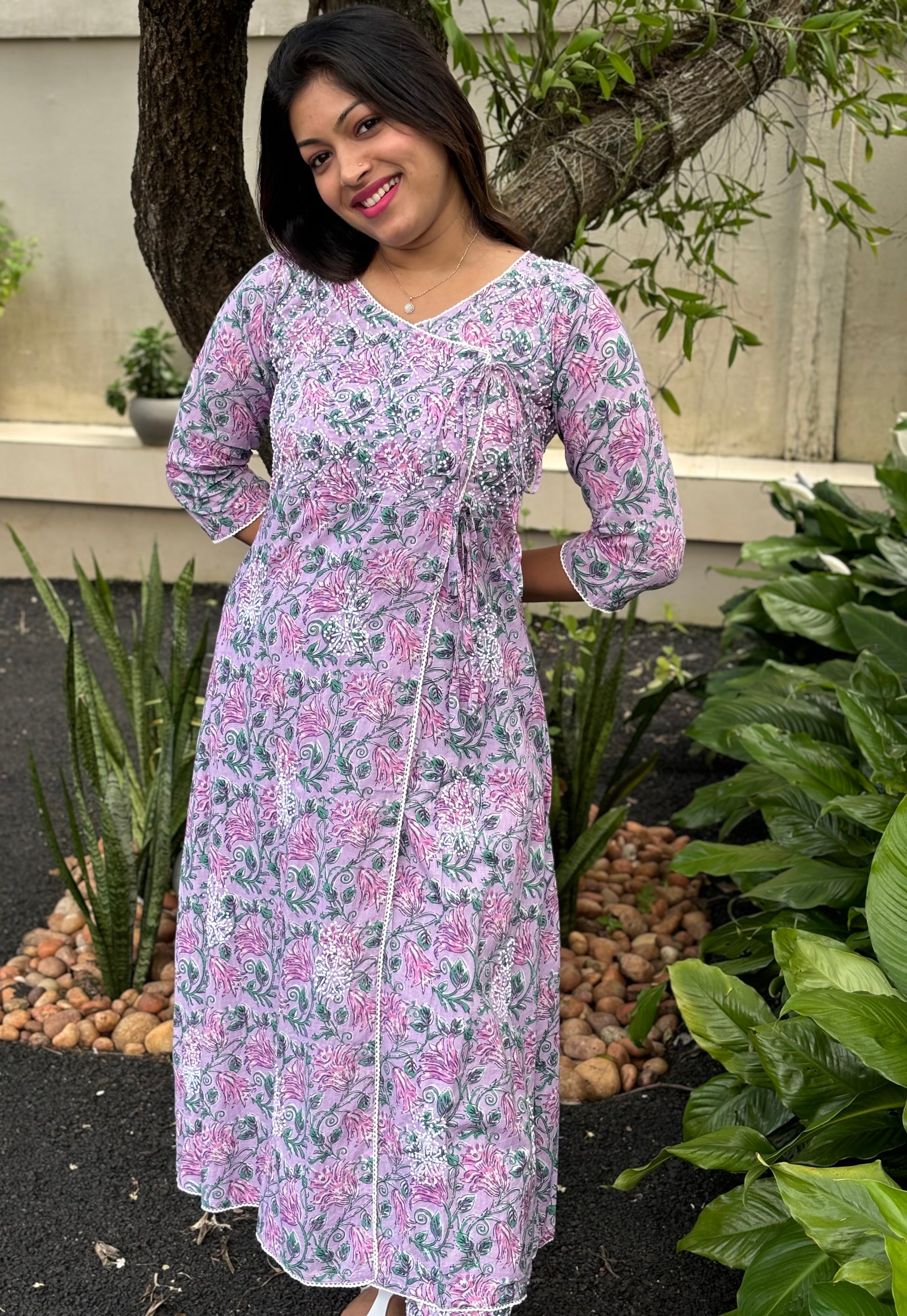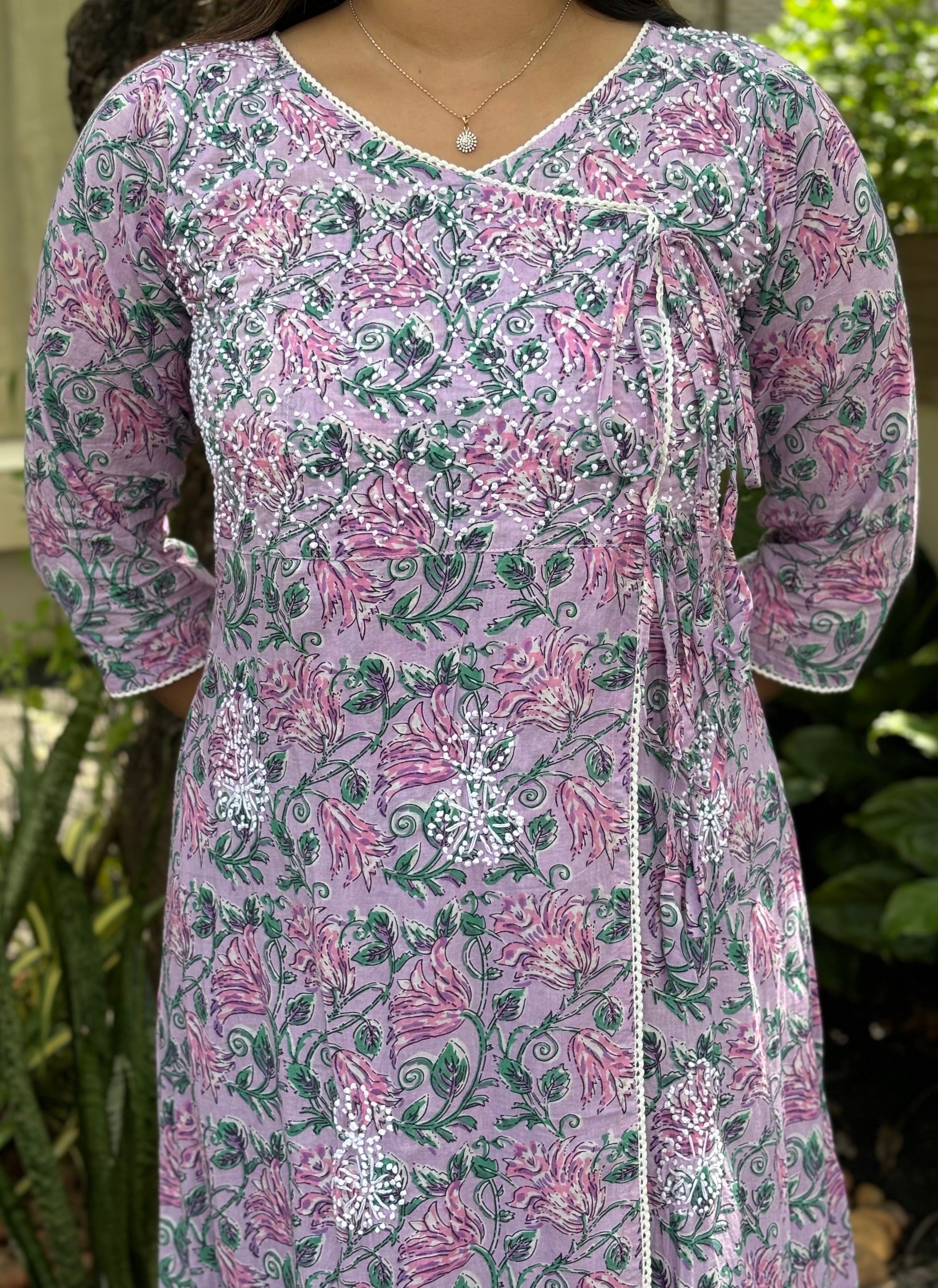 Expertly handcrafted in India for you, this Angrakha stands out in its elegant simplicity. Made of Jaipur block printed cotton and adorned with intricate French knot handwork, this piece is a true work of art. Perfect for anyone looking for a unique and beautiful addition to their wardrobe.