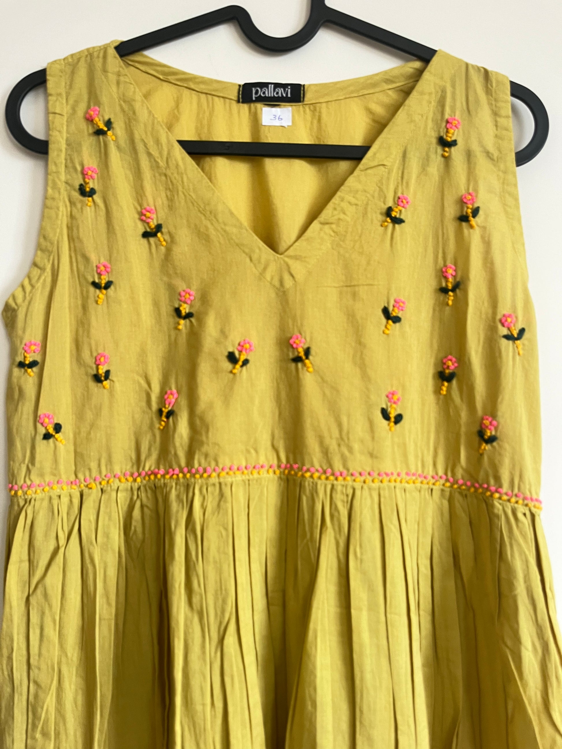 Expertly handcrafted in India for you, this Sleeveless A line stands out in its elegant simplicity. Made of Muslin Cotton, it's in-house dyed, adorned with intricate French knot handwork and gathers on the front portion of the dress, this piece is a true work of art. Perfect for anyone looking for a unique and beautiful addition to their wardrobe.