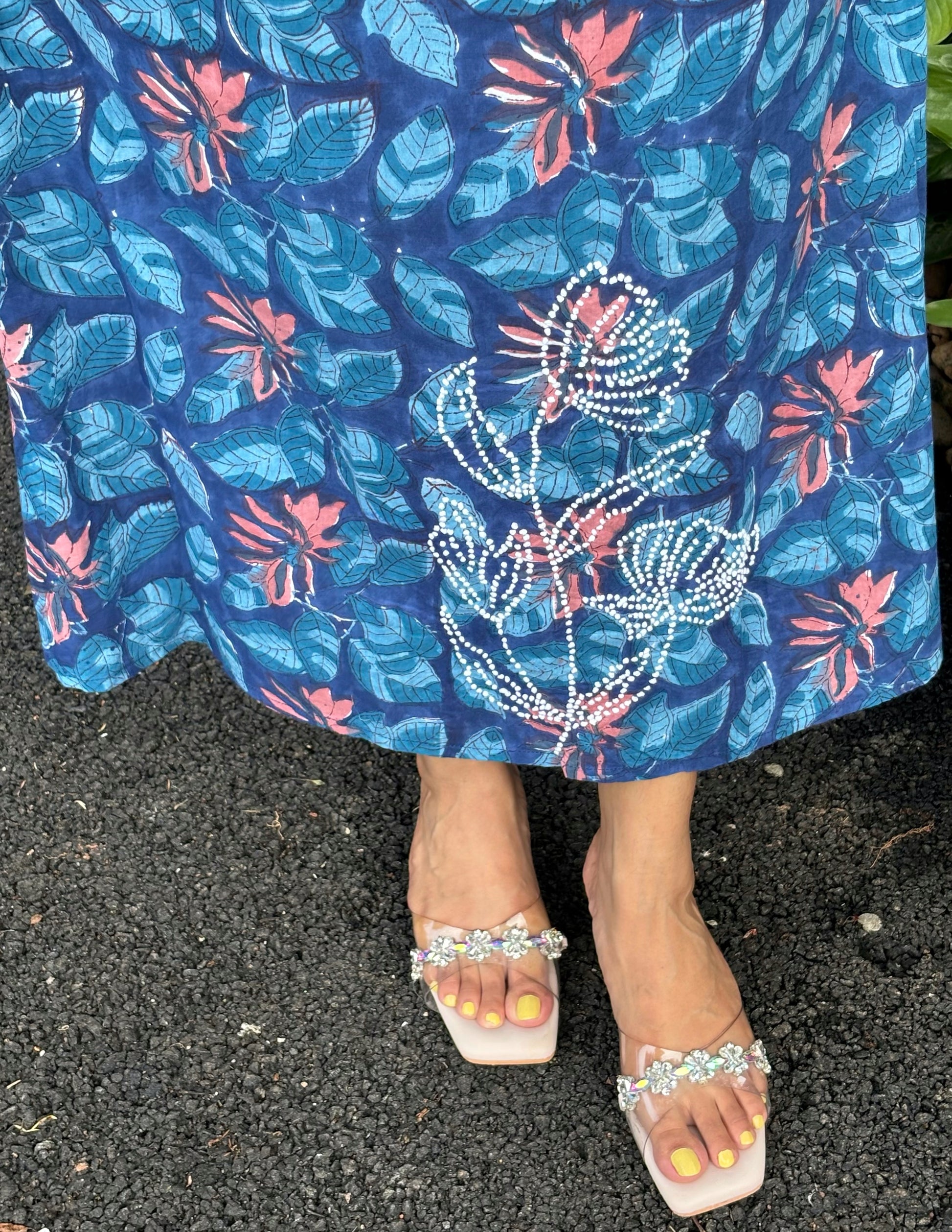 Expertly handcrafted in India for you, this Sleeveless A line stands out in its elegant simplicity. Made of Jaipur block printed cotton and adorned with intricate French knot handwork, this piece is a true work of art. Perfect for anyone looking for a unique and beautiful addition to their wardrobe.