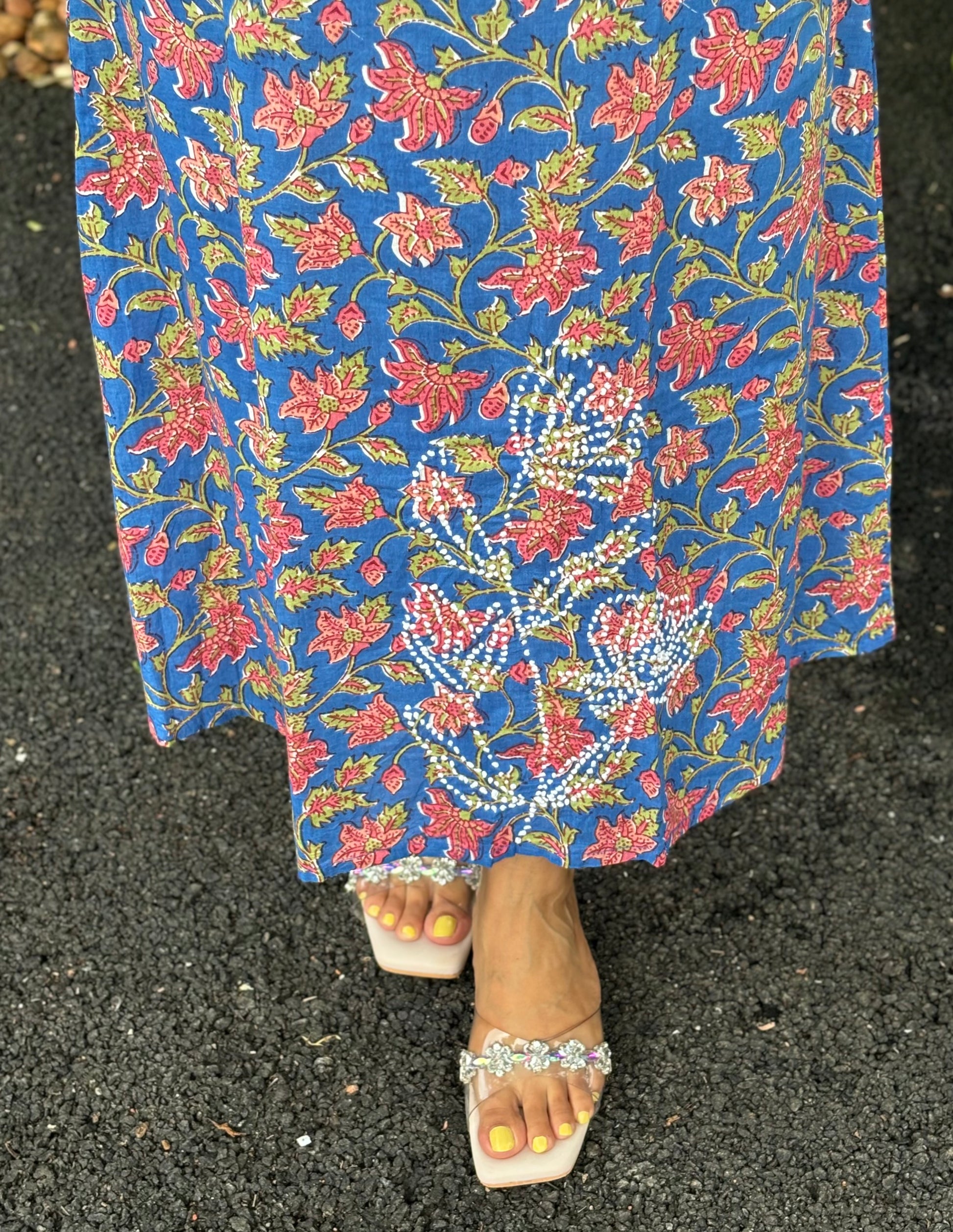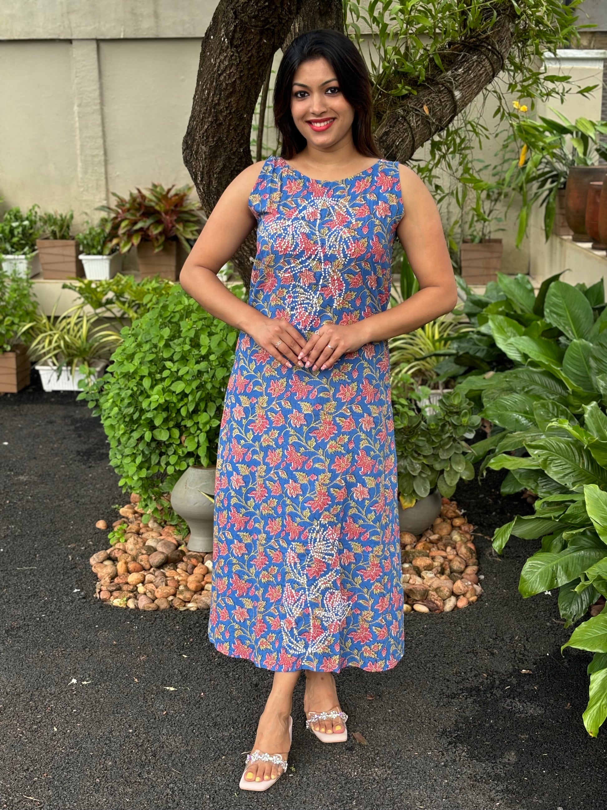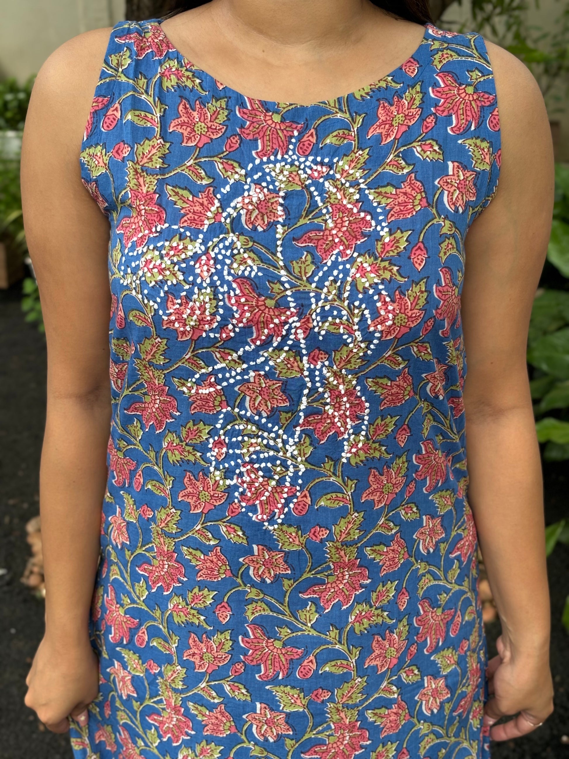 Expertly handcrafted in India for you, this Sleeveless A line stands out in its elegant simplicity. Made of Jaipur block printed cotton and adorned with intricate French knot handwork, this piece is a true work of art. Perfect for anyone looking for a unique and beautiful addition to their wardrobe.