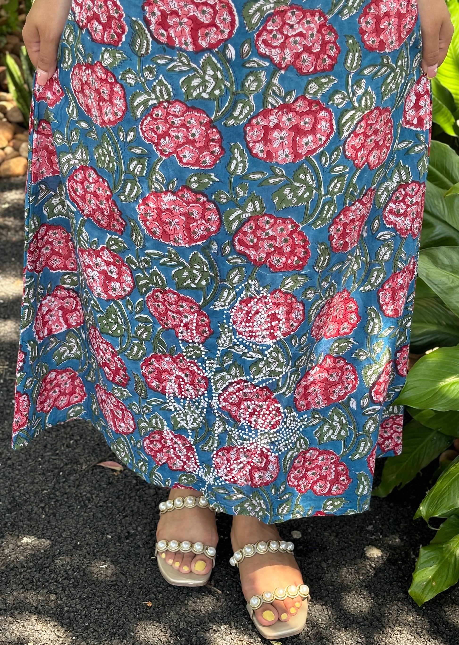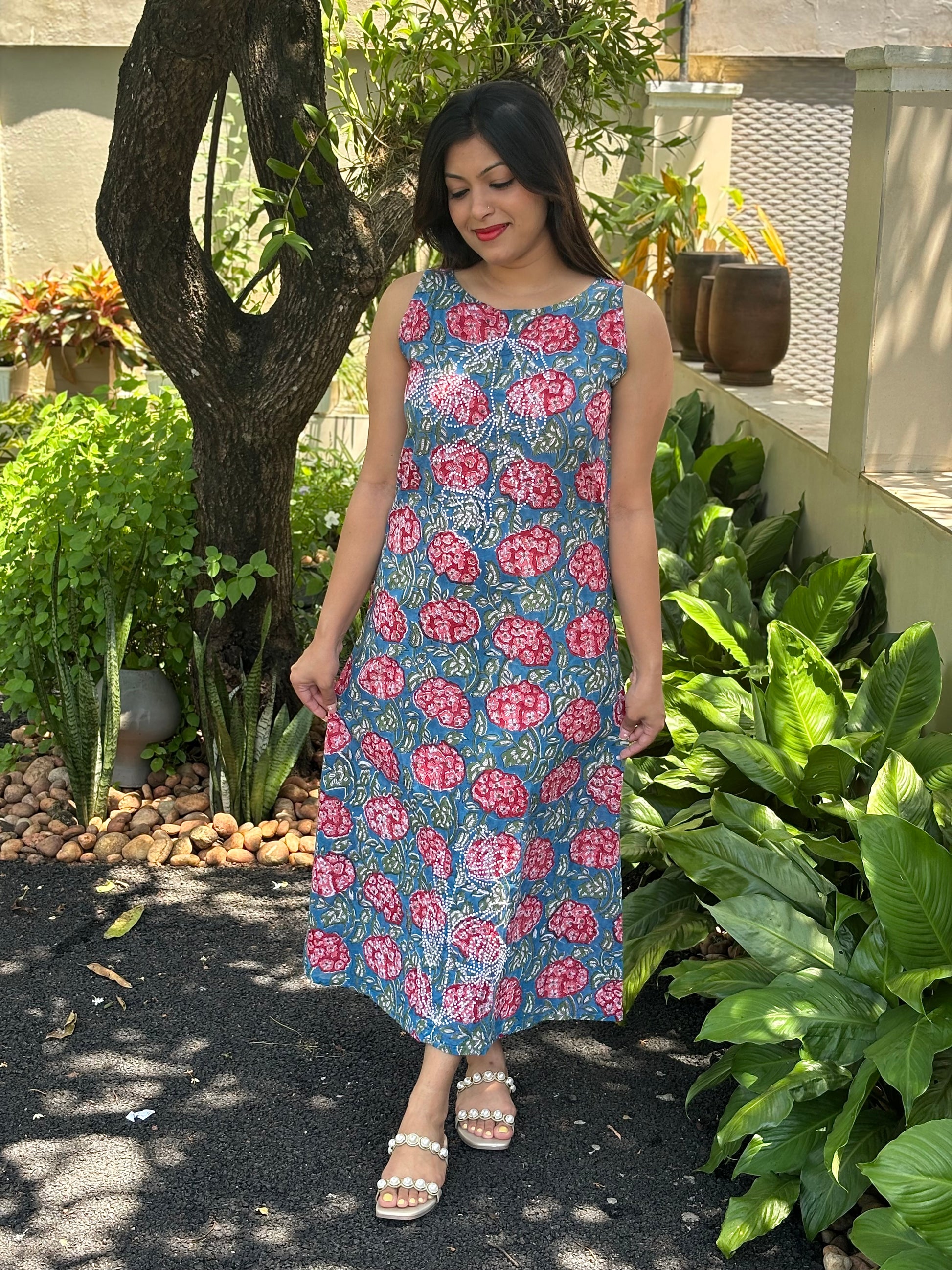 Expertly handcrafted in India for you, this Sleeveless A line stands out in its elegant simplicity. Made of Jaipur block printed cotton and adorned with intricate French knot handwork, this piece is a true work of art. Perfect for anyone looking for a unique and beautiful addition to their wardrobe.