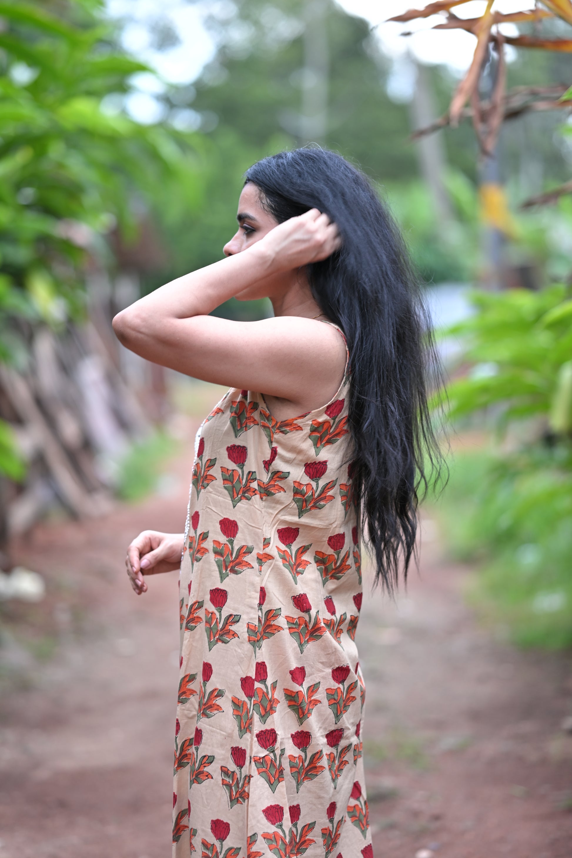 Expertly handcrafted in India for you, this Sleeveless A line stands out in its elegant simplicity. Made of Jaipur block printed cotton and adorned with intricate French knot handwork, this piece is a true work of art. Perfect for anyone looking for a unique and beautiful addition to their wardrobe.