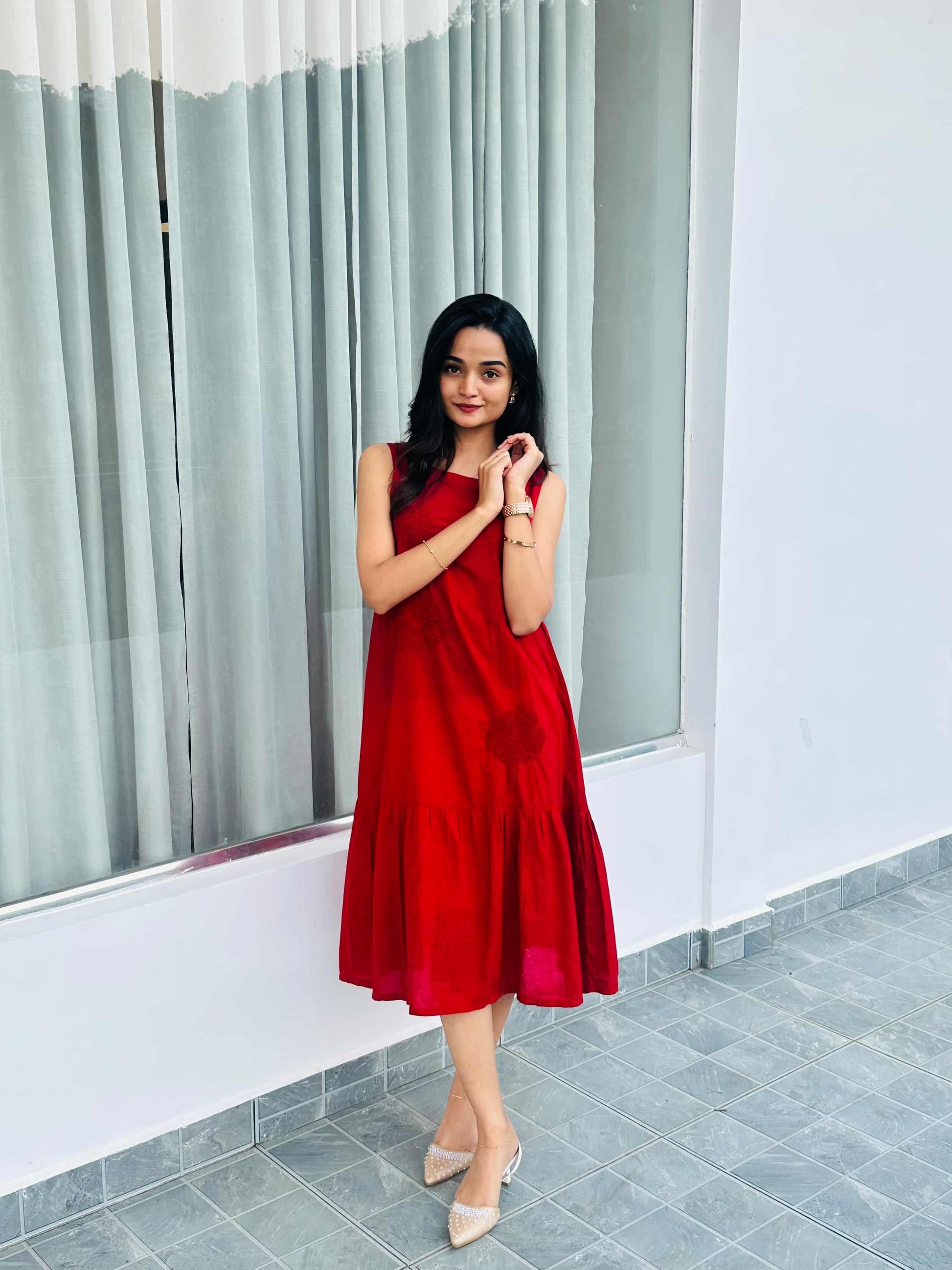 Expertly handcrafted in India for you, this Sleeveless dress stands out in its elegant simplicity. Made of Muslin Cotton, it's in-house dyed and adorned with intricate French knot handwork with frill at the bottom, this piece is a true work of art. Perfect for anyone looking for a unique and beautiful addition to their wardrobe.