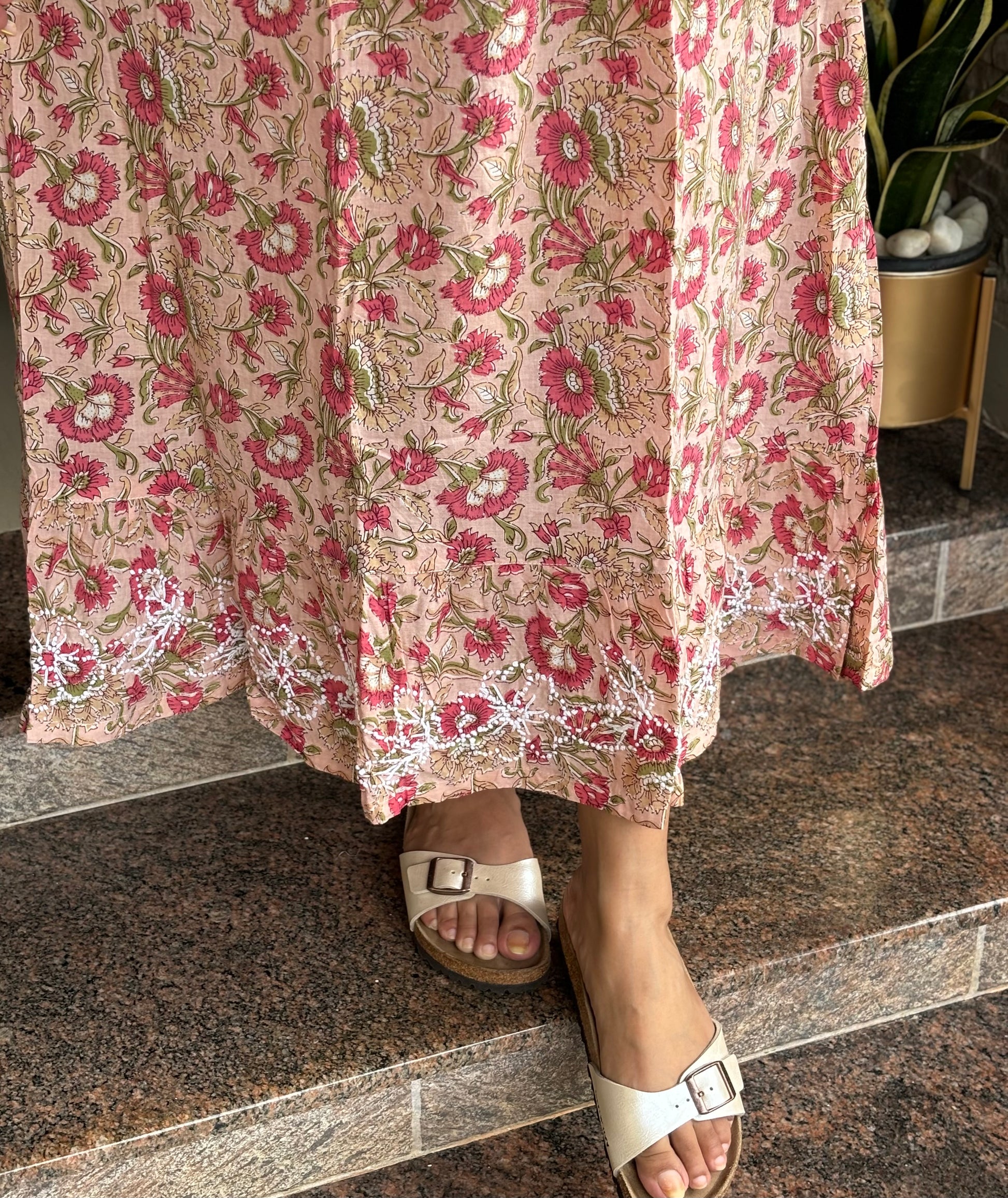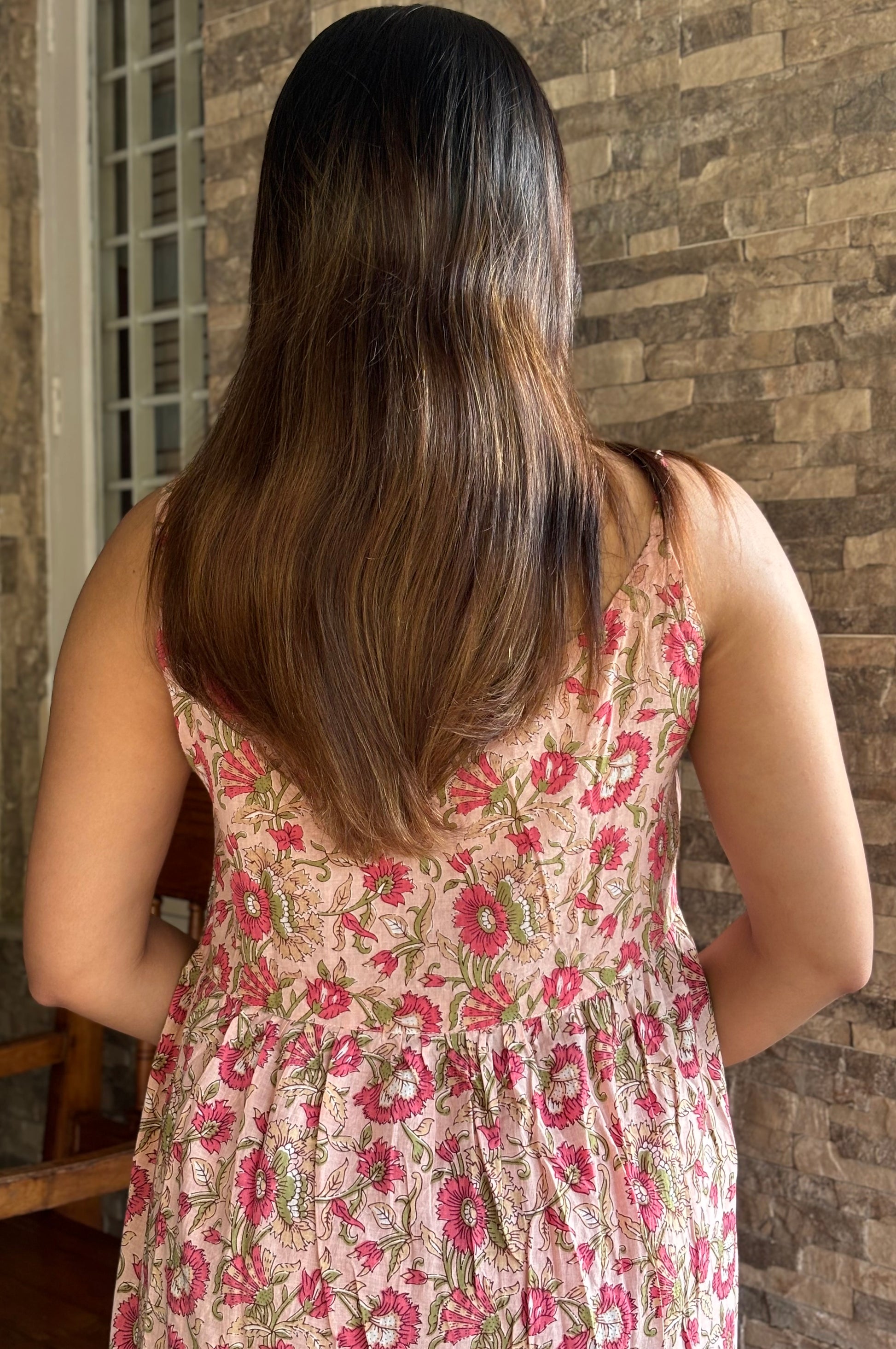 Expertly handcrafted in India for you, this Sleeveless A line dress stands out in its elegant simplicity. Made of Jaipur block printed cotton, and adorned with intricate French knot handwork with gathers and frill (front and back), this piece is a true work of art. Perfect for anyone looking for a unique and beautiful addition to their wardrobe.