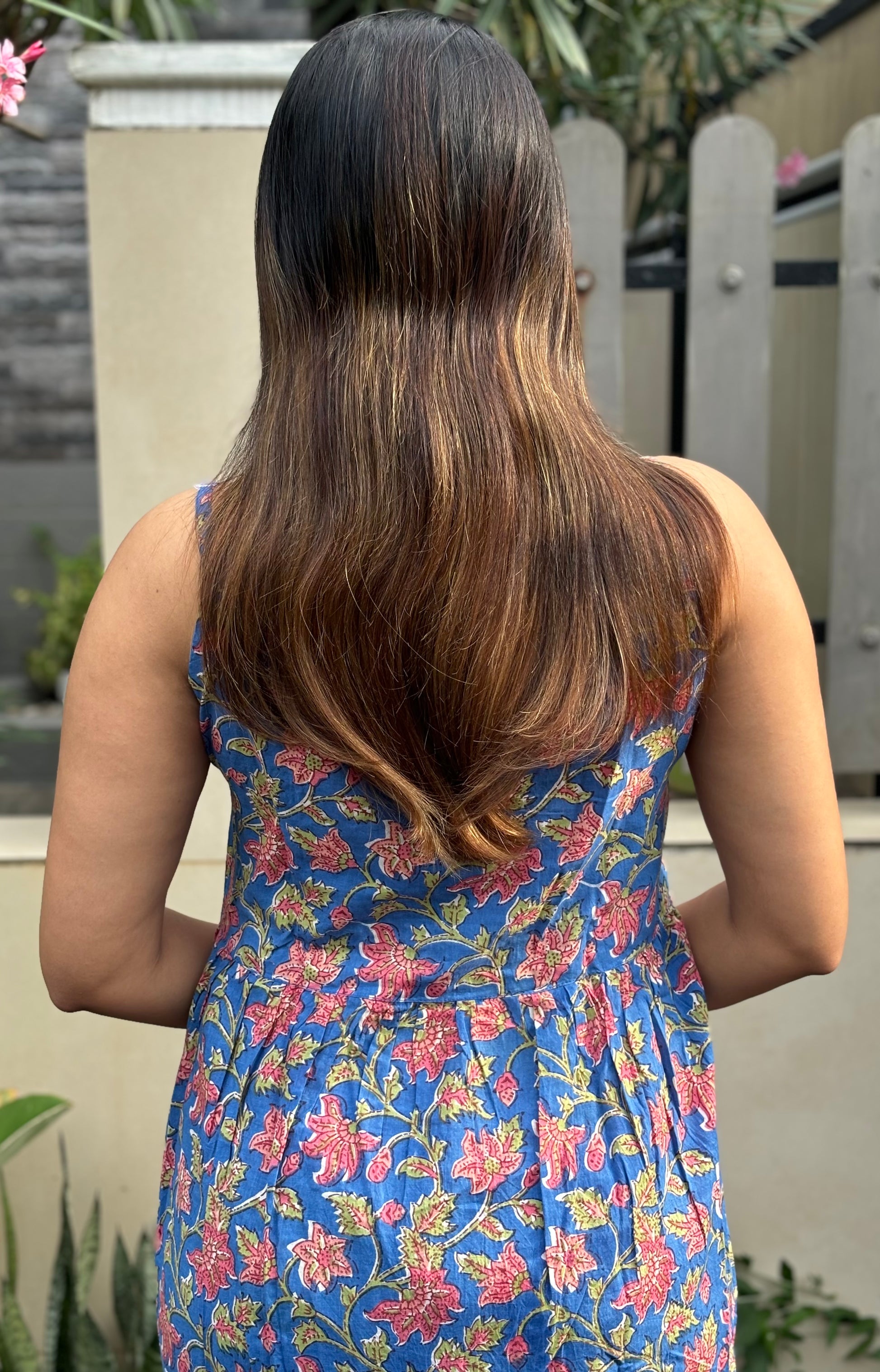 Expertly handcrafted in India for you, this Sleeveless A line dress stands out in its elegant simplicity. Made of Jaipur block printed cotton, and adorned with intricate French knot handwork with gathers and frill (front and back), this piece is a true work of art. Perfect for anyone looking for a unique and beautiful addition to their wardrobe.