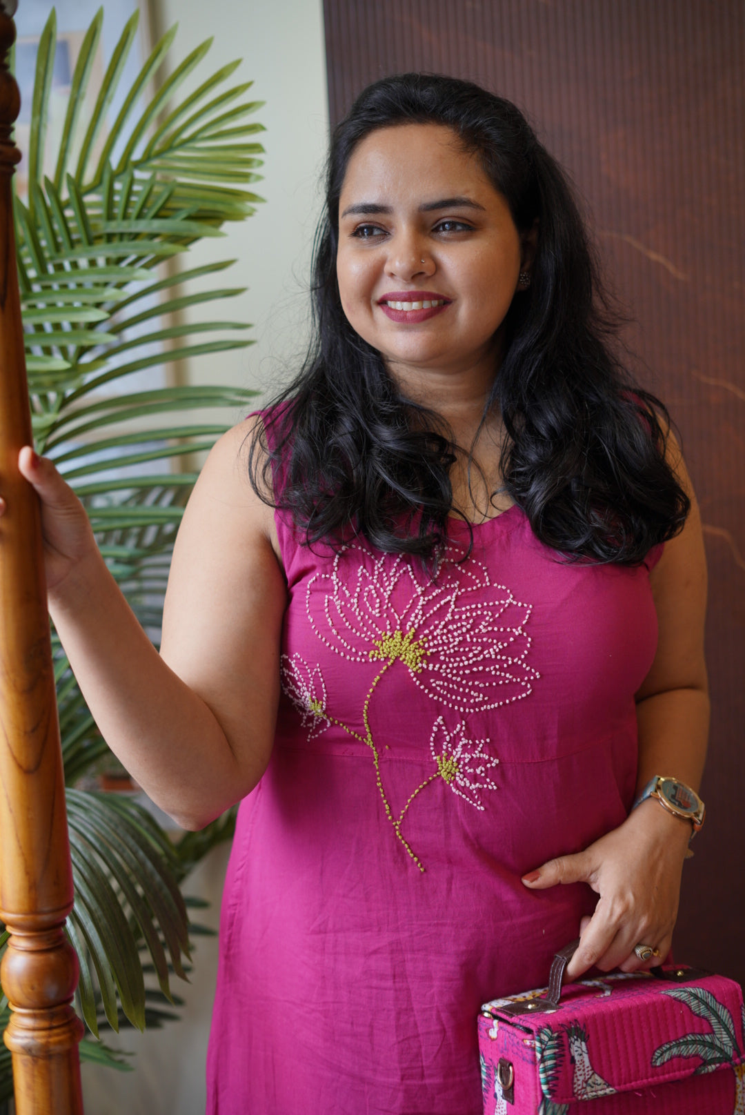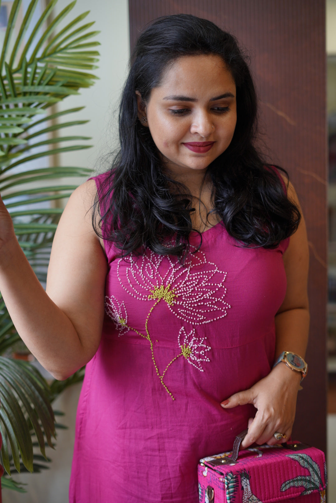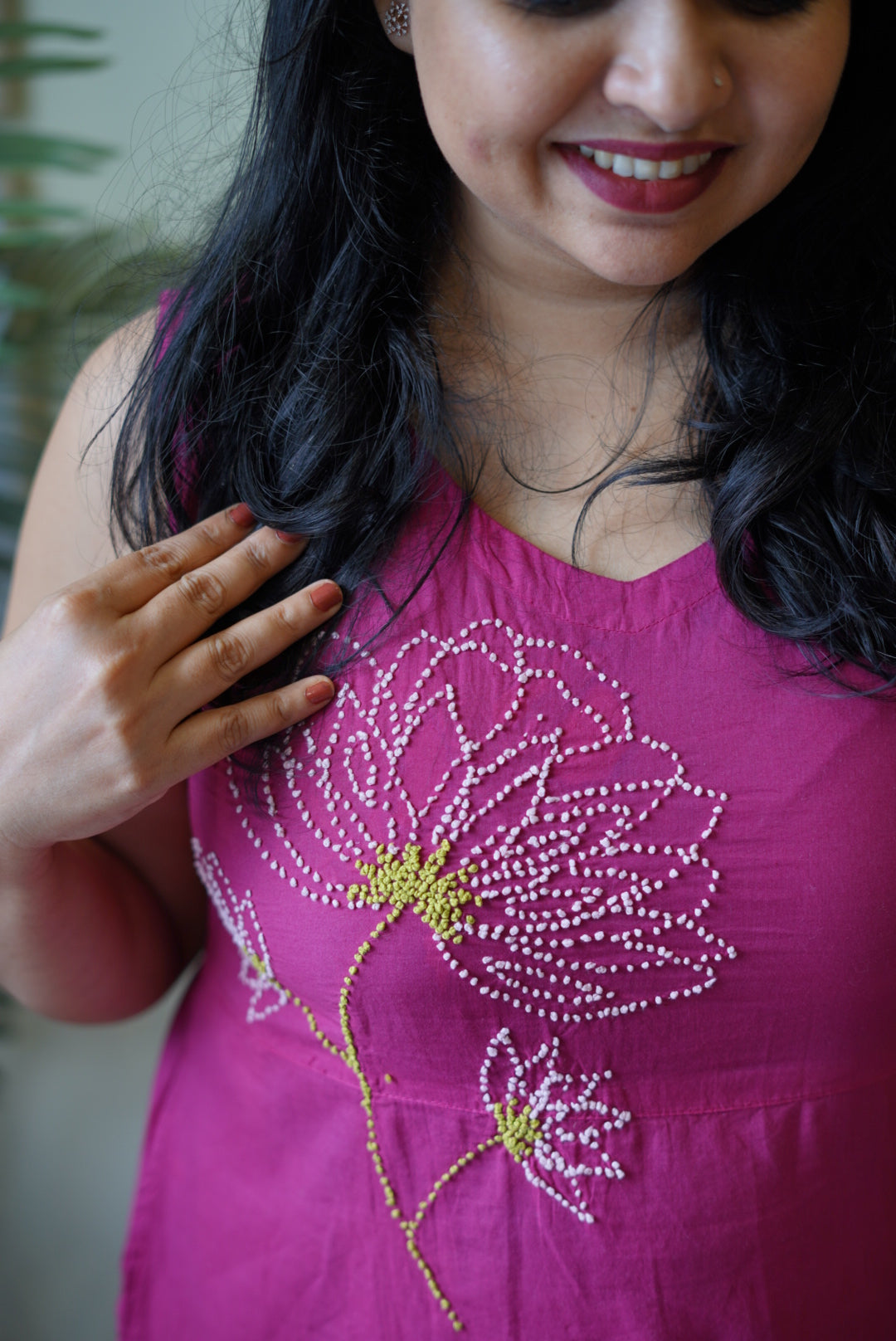 Expertly handcrafted in India for you, this Sleeveless A line dress stands dress out in its elegant simplicity and pockets on both sides. Made of muslin cotton, in-house dyed and adorned with intricate French knot handwork, this piece is a true work of art. Perfect for anyone looking for a unique and beautiful addition to their wardrobe