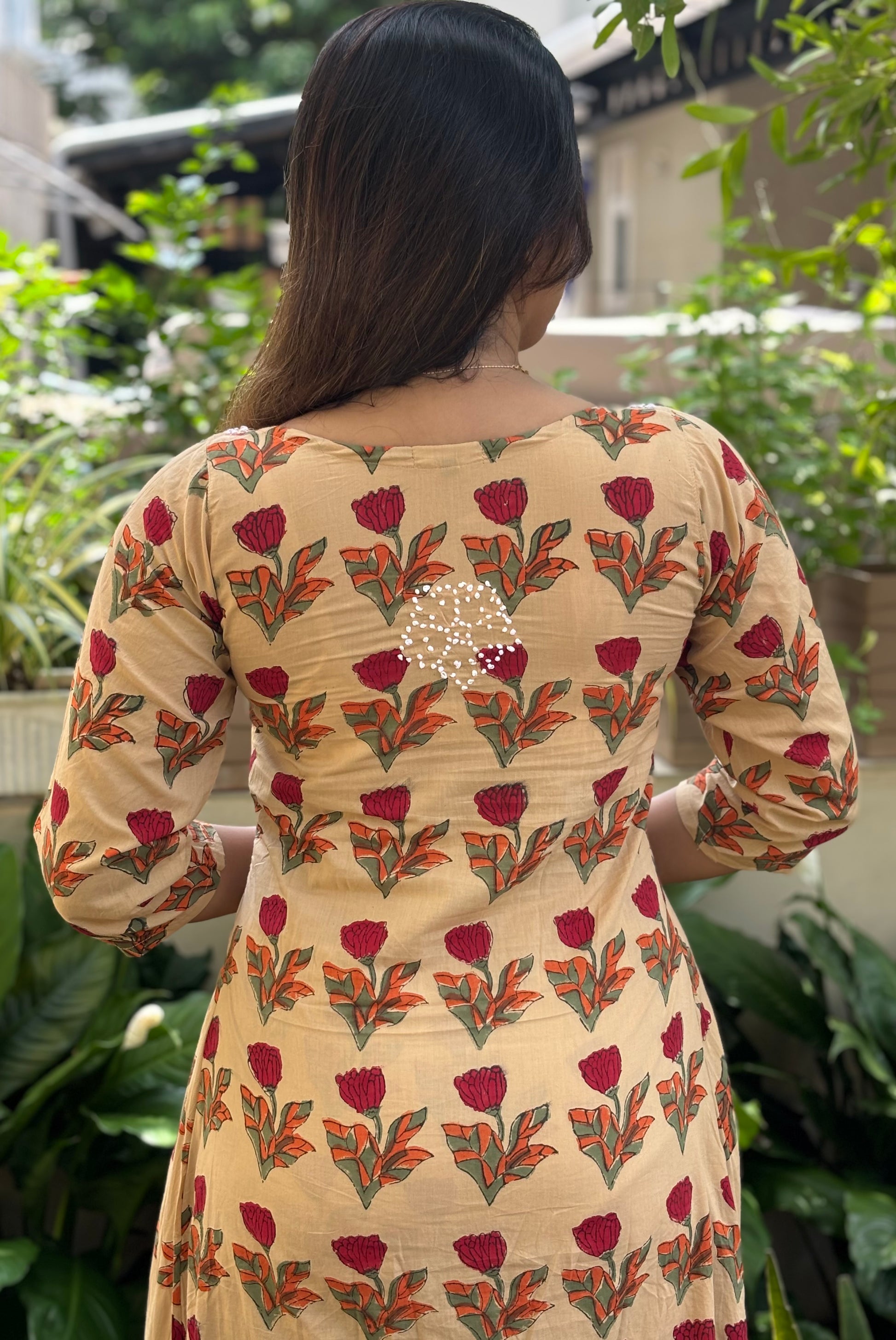 Expertly handcrafted in India for you, this Pleated Dress (pleats only on front portion of the dress) stands out in its elegant simplicity.. Made of Jaipur block printed cotton and adorned with intricate French knot handwork, this piece is a true work of art. Perfect for anyone looking for a unique and beautiful addition to their wardrobe.