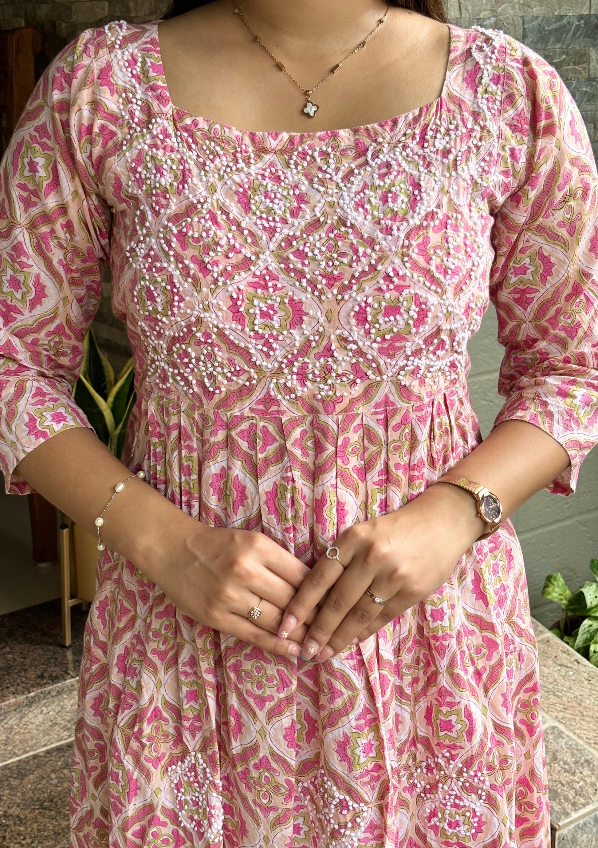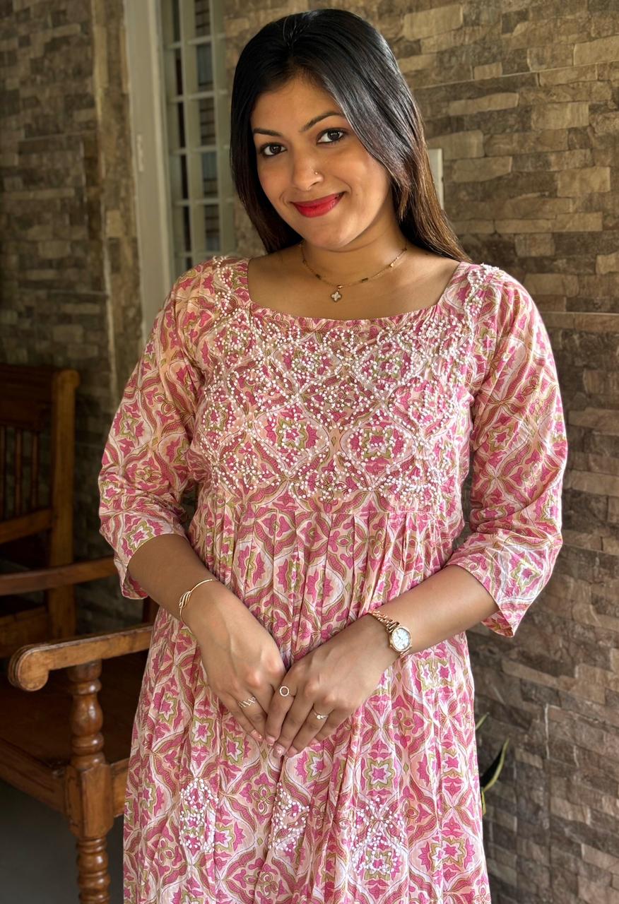 Expertly handcrafted in India for you, this Pleated Dress (pleats only on front portion of the dress) stands out in its elegant simplicity.. Made of Jaipur block printed cotton and adorned with intricate French knot handwork, this piece is a true work of art. Perfect for anyone looking for a unique and beautiful addition to their wardrobe.