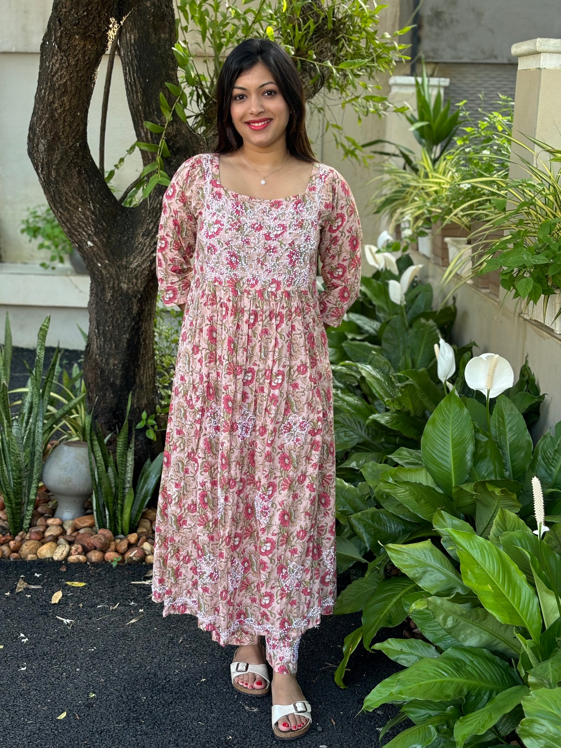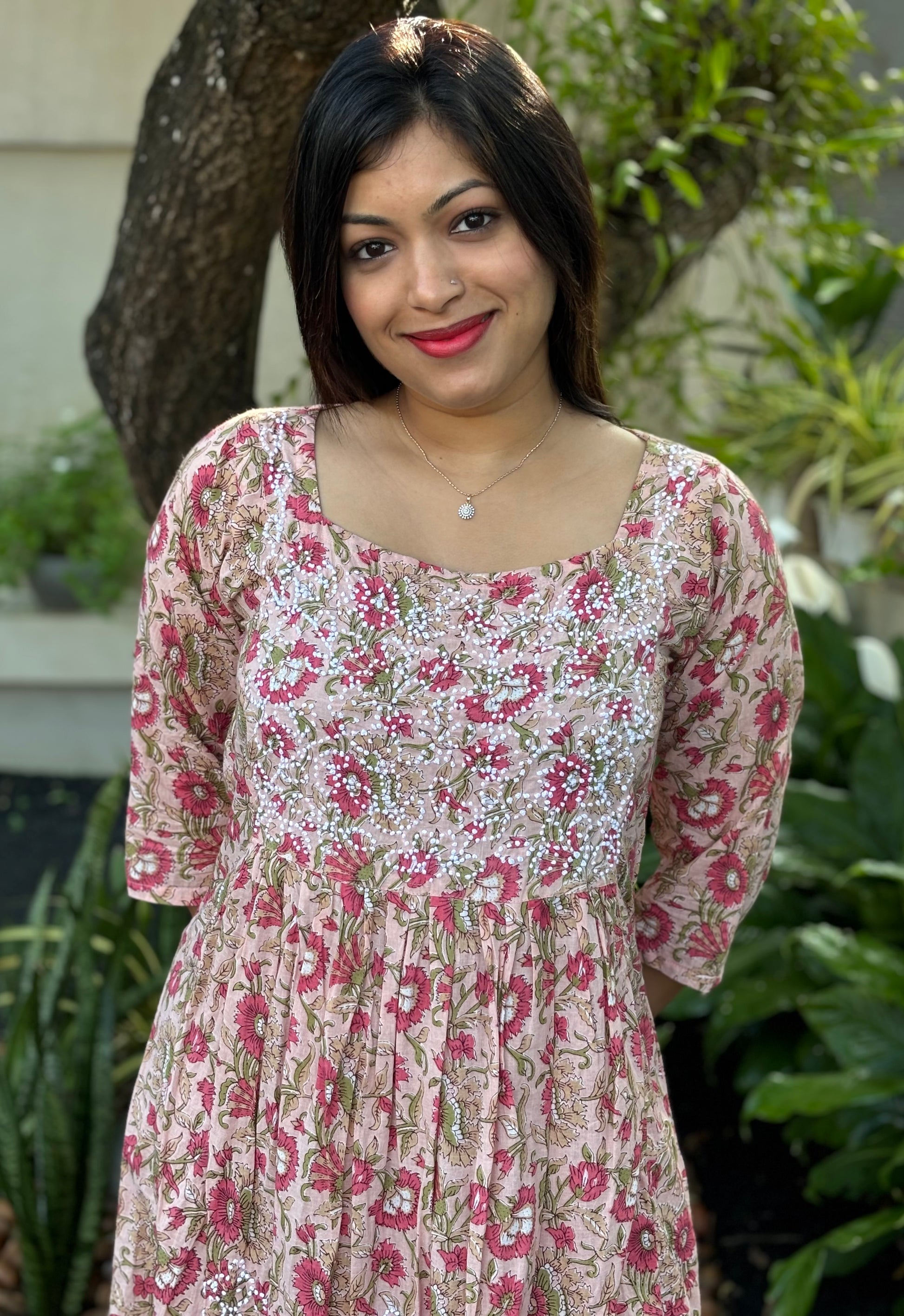 Expertly handcrafted in India for you, this Pleated Dress (pleats only on front portion of the dress) stands out in its elegant simplicity.. Made of Jaipur block printed cotton and adorned with intricate French knot handwork, this piece is a true work of art. Perfect for anyone looking for a unique and beautiful addition to their wardrobe.