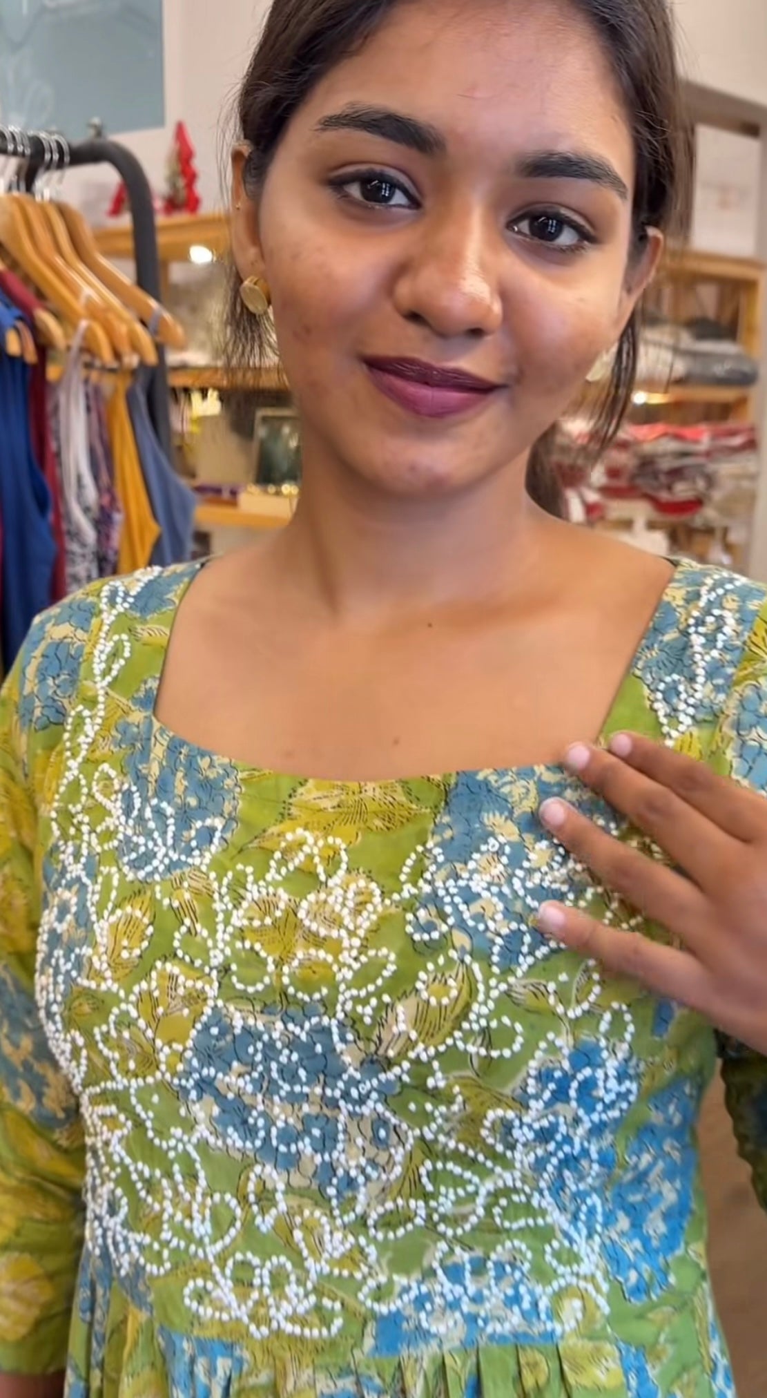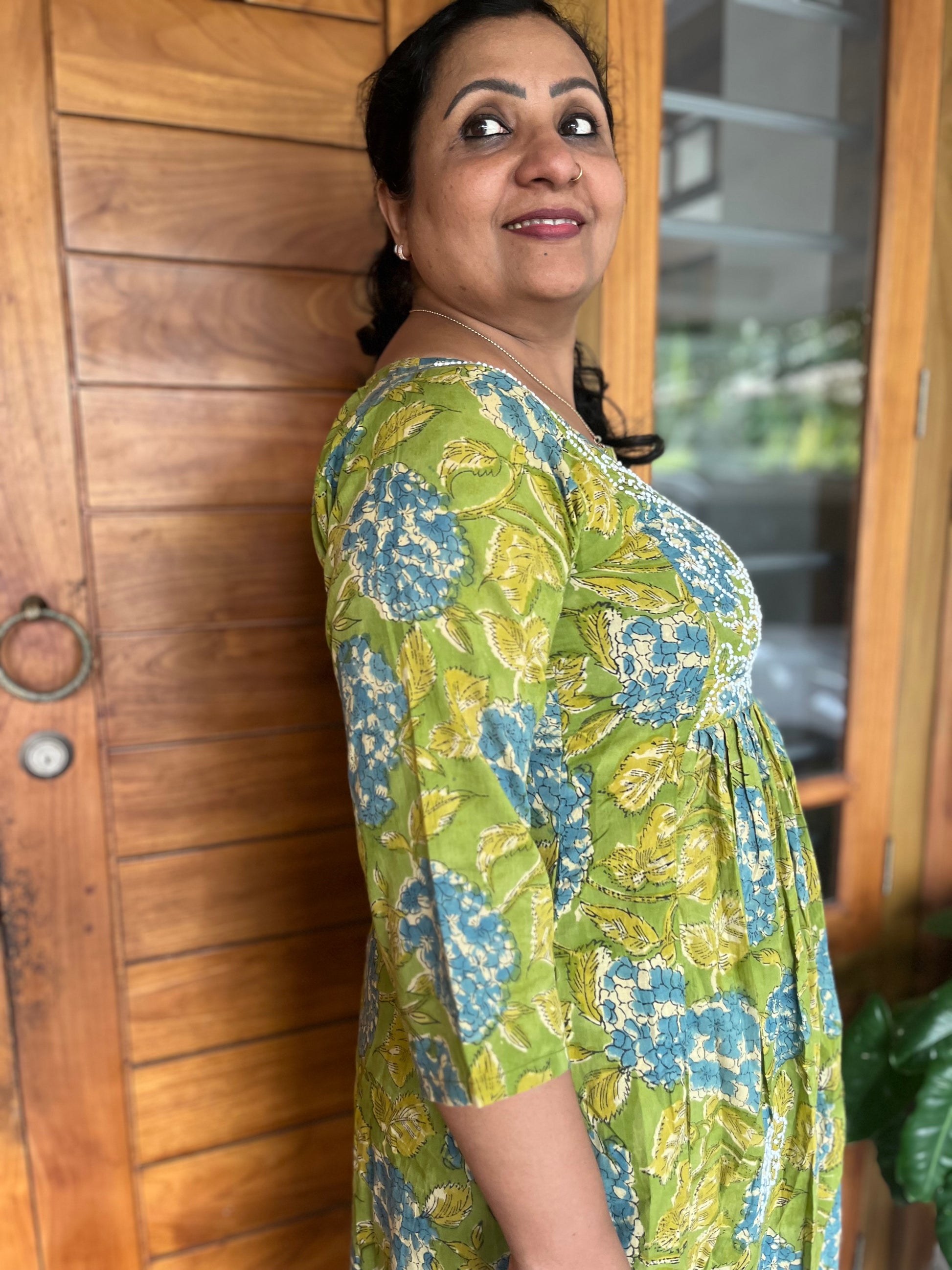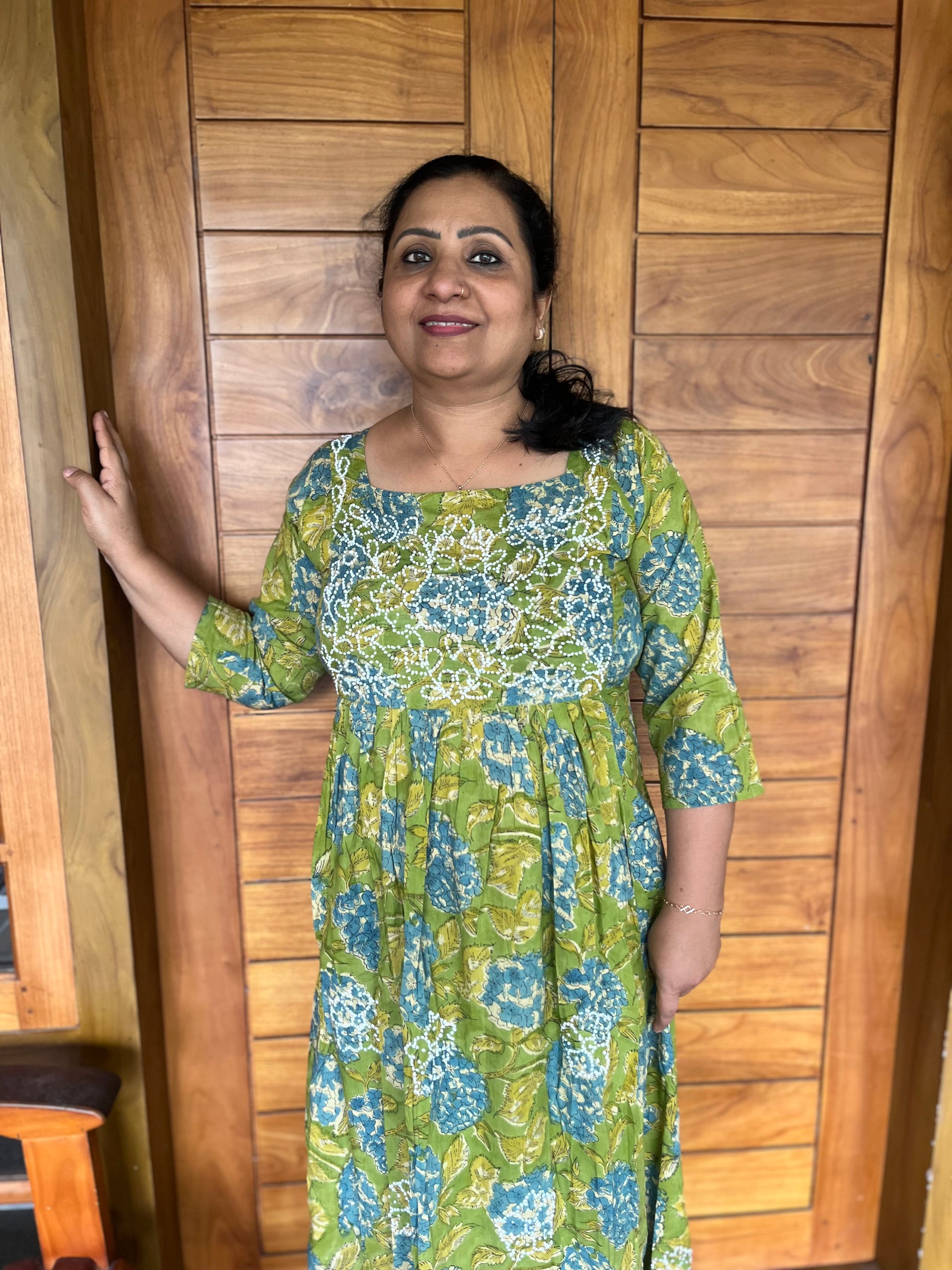 Expertly handcrafted in India for you, this Pleated Dress (pleats only on front portion of the dress) stands out in its elegant simplicity.. Made of Jaipur block printed cotton and adorned with intricate French knot handwork, this piece is a true work of art. Perfect for anyone looking for a unique and beautiful addition to their wardrobe.