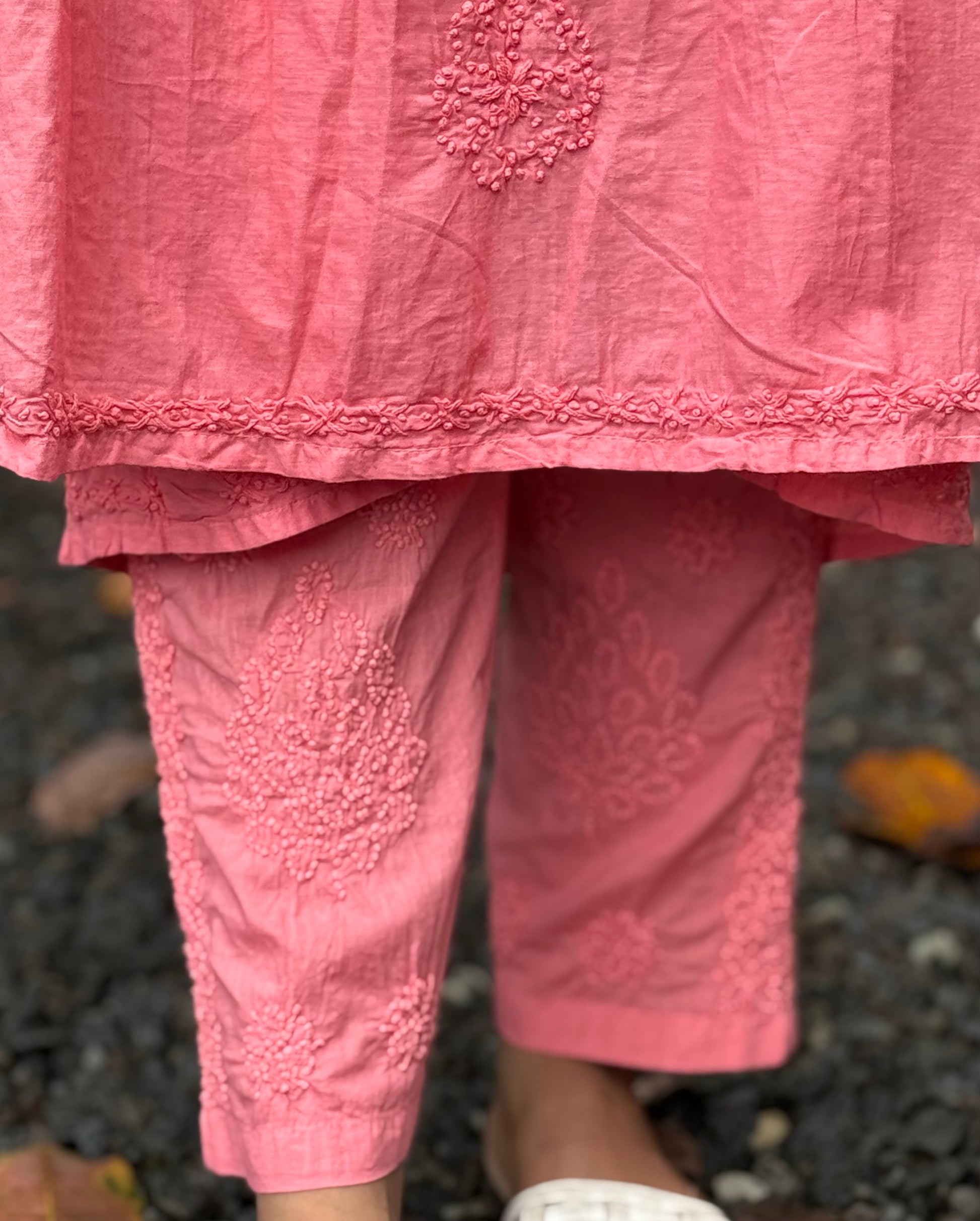 Expertly handcrafted in India for you, this Aliya Cut Dress and pants stands out in its elegant simplicity. Made of Muslin Cotton, it's in-house dyed and adorned with intricate French knot handwork on both front and back, this dress is a true work of art pairing with same shaded pants with pockets on both sides. Perfect for anyone looking for a unique and beautiful addition to their wardrobe. Additionally, the fabric is dyeable, allowing for endless styling possibilities.
