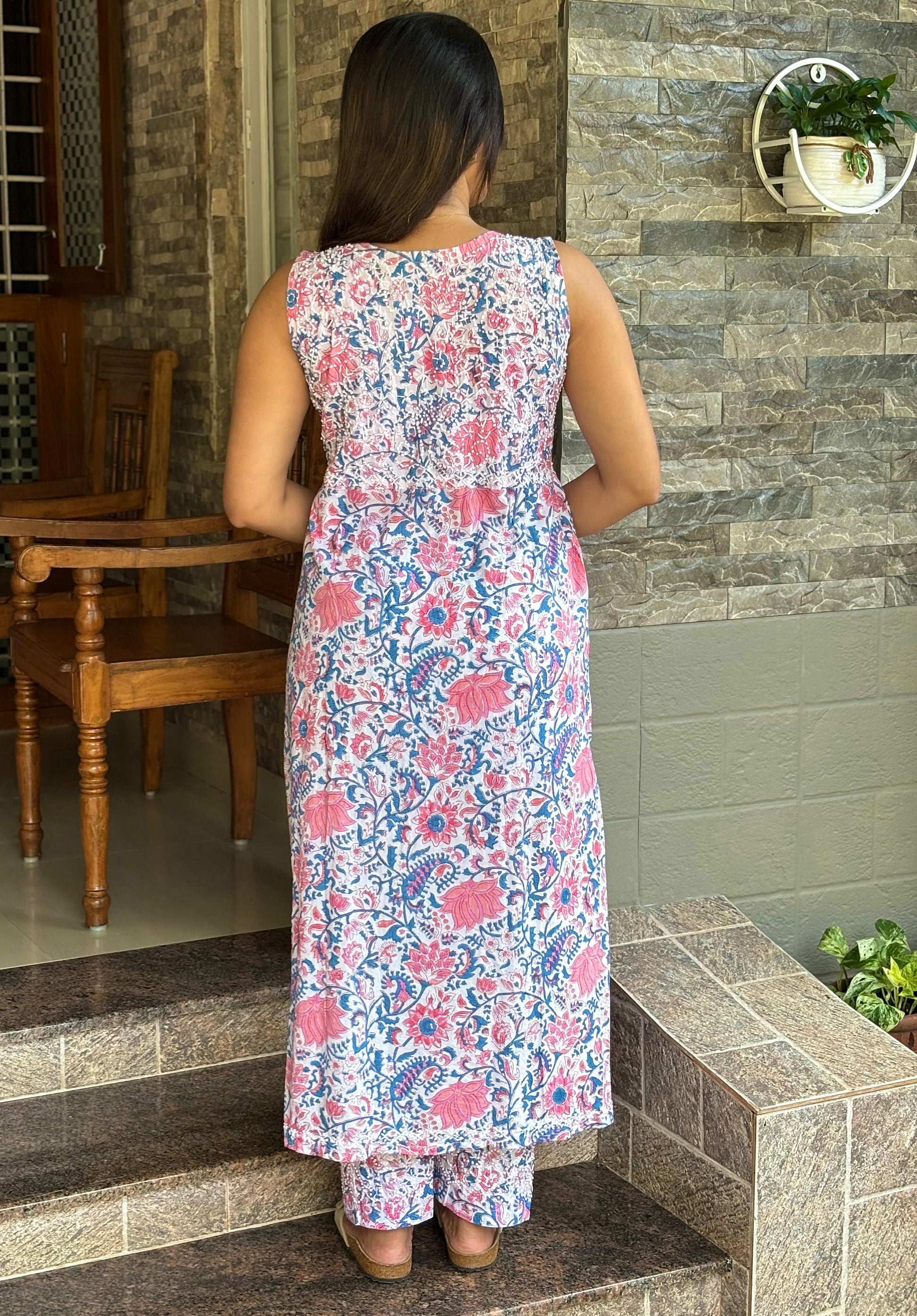 Expertly handcrafted in India for you, this Aliya Cut Dress and pants stands out in its elegant simplicity. Made of Jaipur block printed cotton and adorned with intricate French knot handwork, this dress is a true work of art pairing with same printed pants with pockets on both sides. Perfect for anyone looking for a unique and beautiful addition to their wardrobe.