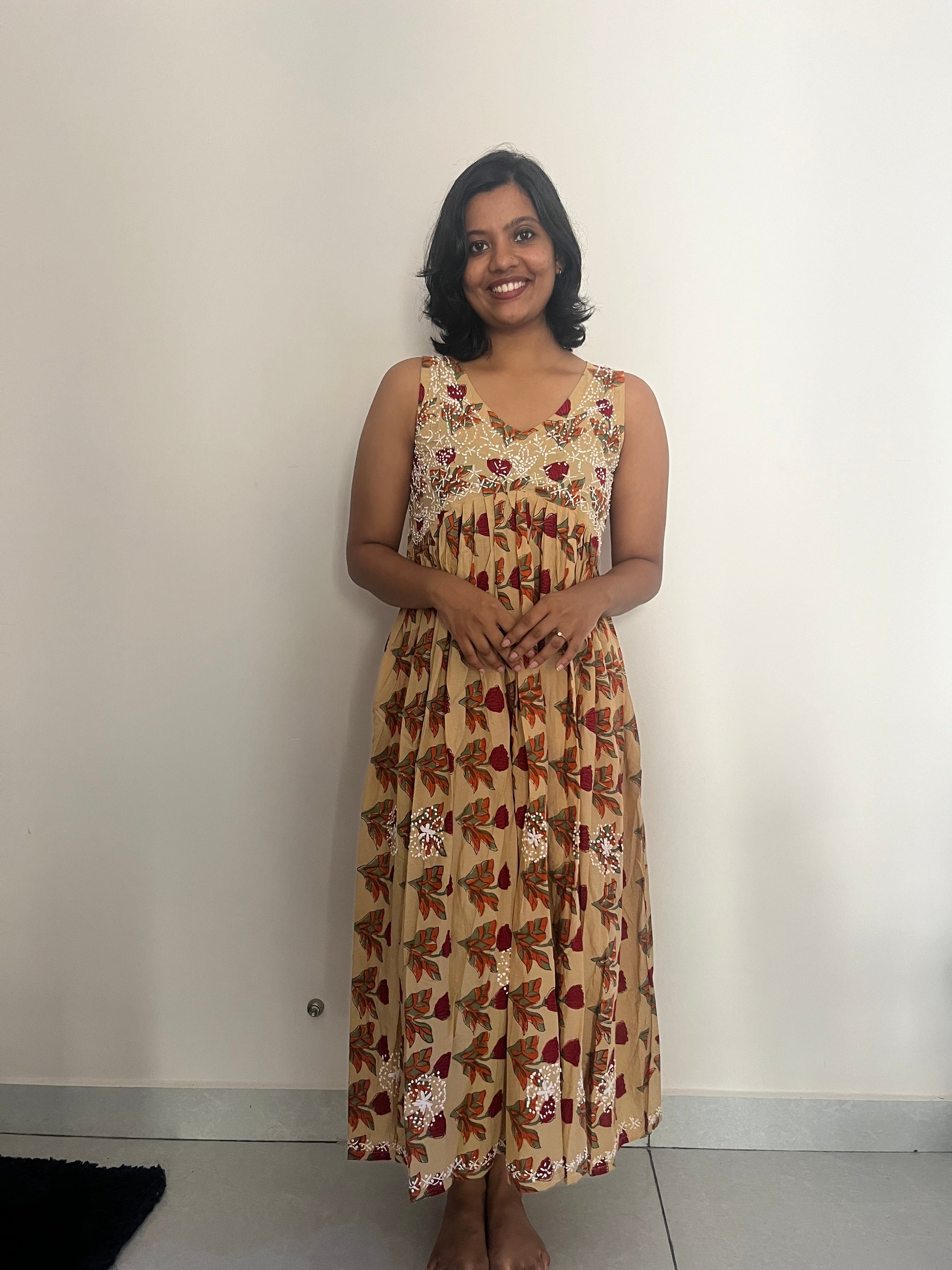 Expertly handcrafted in India for you, this Aliya Cut Dress stands out in its elegant simplicity. Made of Jaipur block printed cotton and adorned with intricate French knot handwork on both front and back, this piece is a true work of art. Perfect for anyone looking for a unique and beautiful addition to their wardrobe.