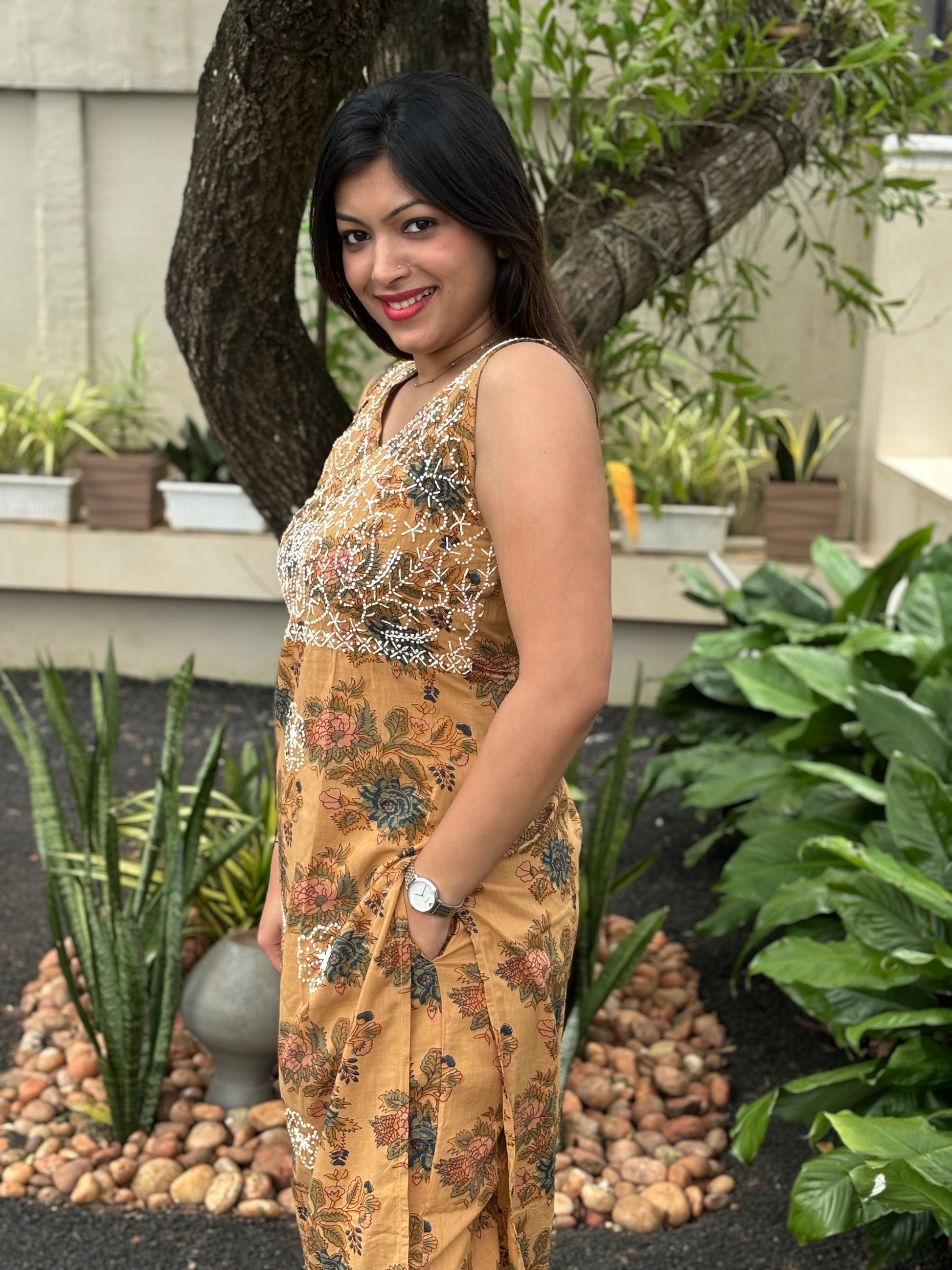 Expertly handcrafted in India for you, this Straight kurti with slits on both sides, this sleeveless coordinated set boasts intricate French knot work on kurti and pant. Loose fitting for maximum comfort, this set is perfect for all-day wear.