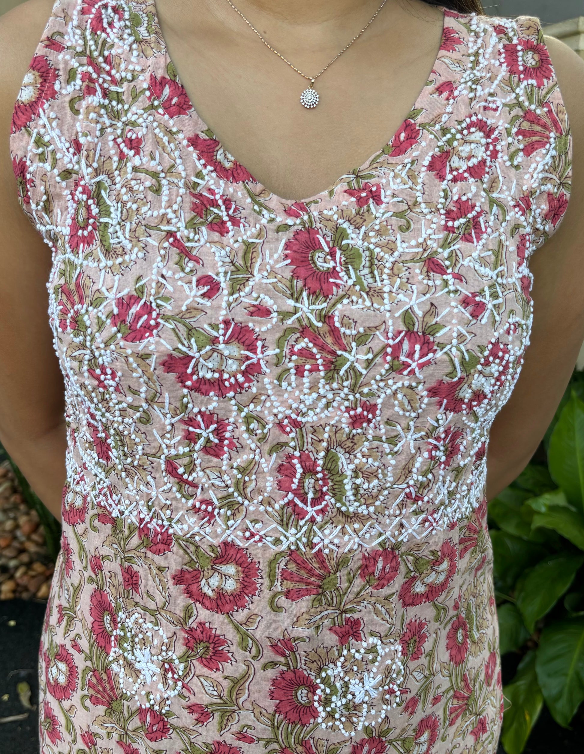 Expertly handcrafted in India for you, this sleeveless Straight kurti with slits on both sides stands out in its elegant simplicity. Made of Jaipur block printed cotton and adorned with intricate French knot handwork, this piece is a true work of art. Perfect for anyone looking for a unique and beautiful addition to their wardrobe.